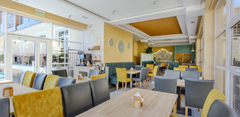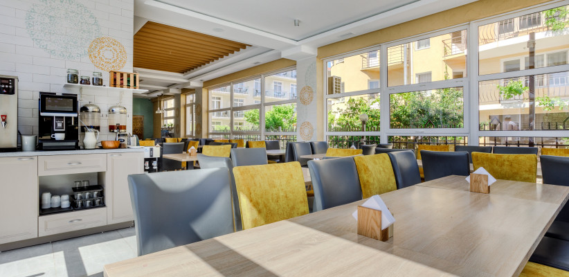 Основной ресторан осуществляет питание гостей по системе «шведский стол». Для маленьких гостей предусмотрены блюда, приготовленные со всеми рекомендациям по детскому диетическому питанию. Также для приготовления пищи есть микроволновка, блендер. В зале ресторана есть детские стульчики. Так же для гостей между основным приемом пищи работает снэк-бар, где можно перекусить и пополнить запасы энергии, а также отдохнуть от палящего солнца и активных забав.