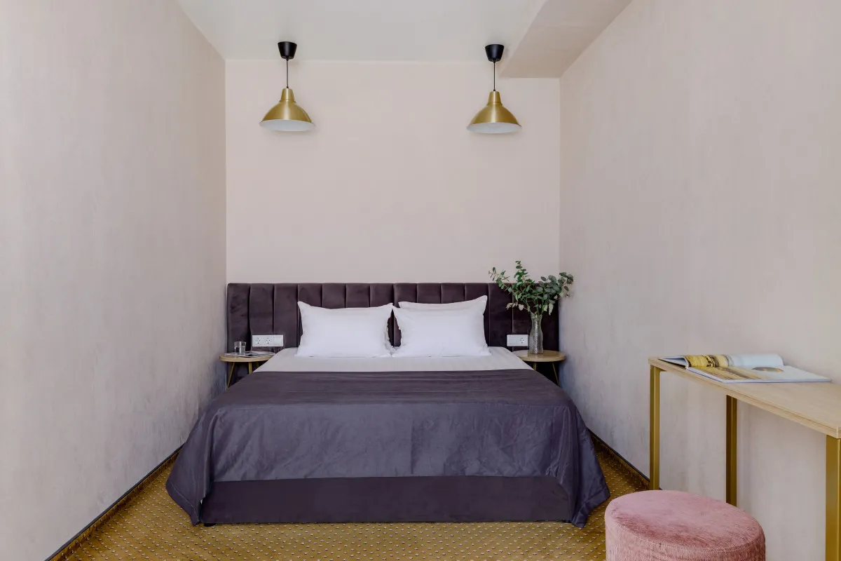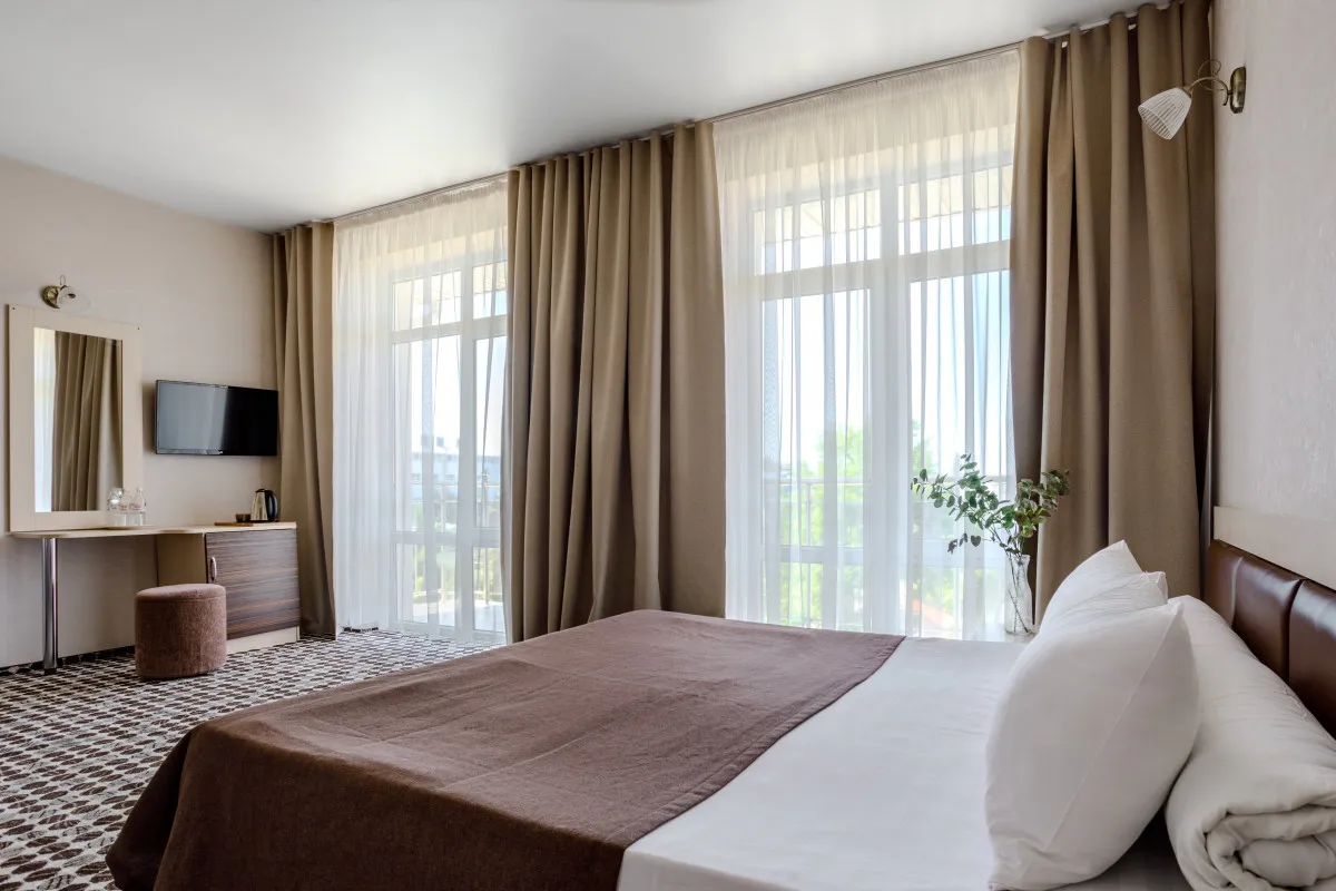 28 м2, 1 двуспальная кровать (бокс-спринг) и 1 диван-кровать. Количество гостей: два человека на основных местах и два человека на дополнительном месте и один ребенок до 5 лет включительно без предоставления доп.места2-х комнатный «Люкс»
