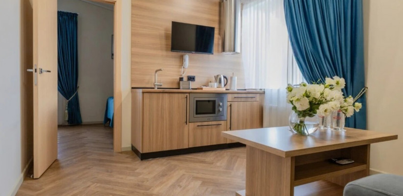 32 м2, две односпальные или двуспальная кровать, диван, гостиная зона, кухонная зона, рабочая зона. Количество гостей: 3.Стандарт "Комфорт"