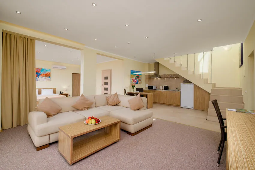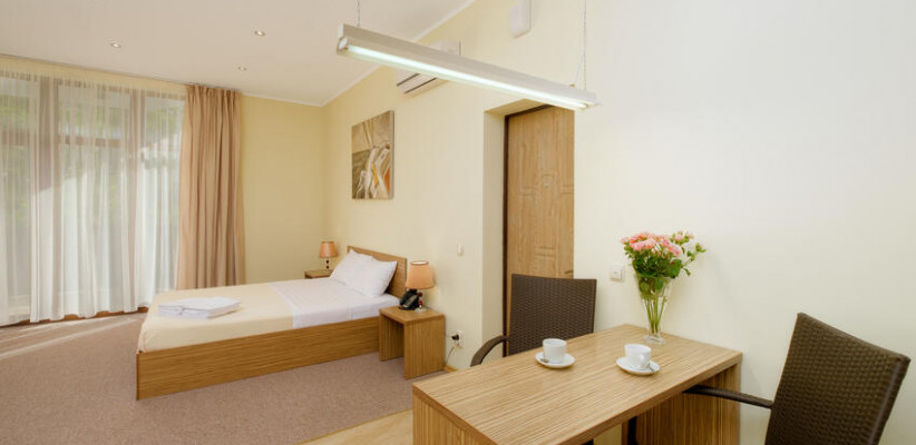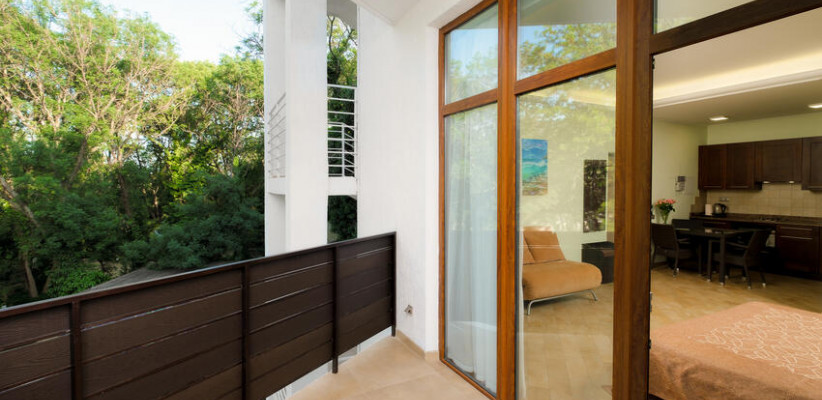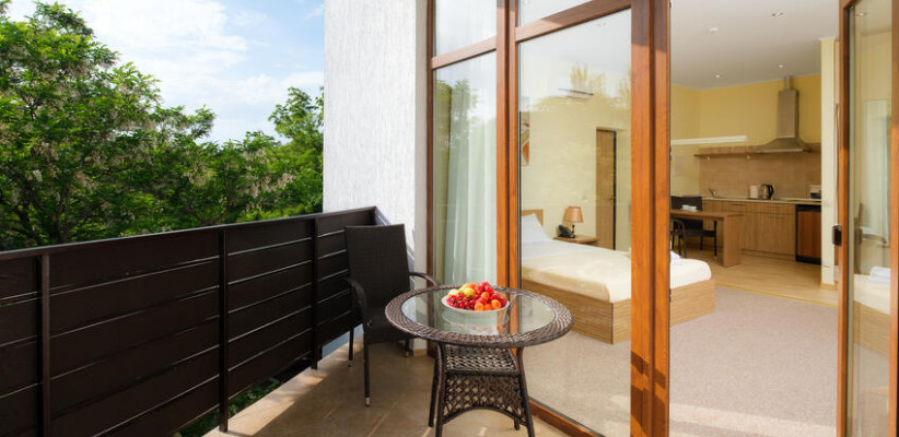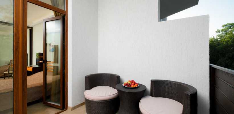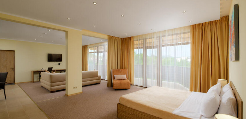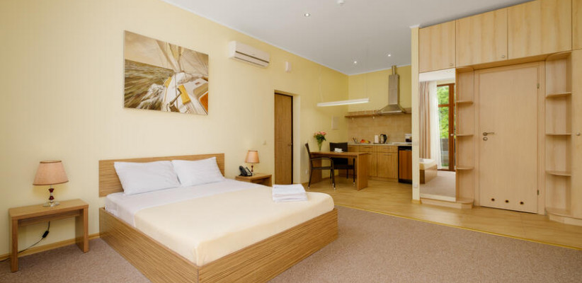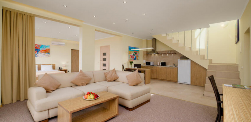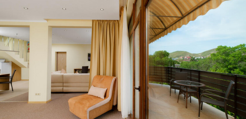 60 м2, балкон с видом на парк, горы и море, спальня с двуспальной кроватью, кресло, просторная гостиная зона, оборудованная кухня, рабочее место.Двухкомнатный люкс