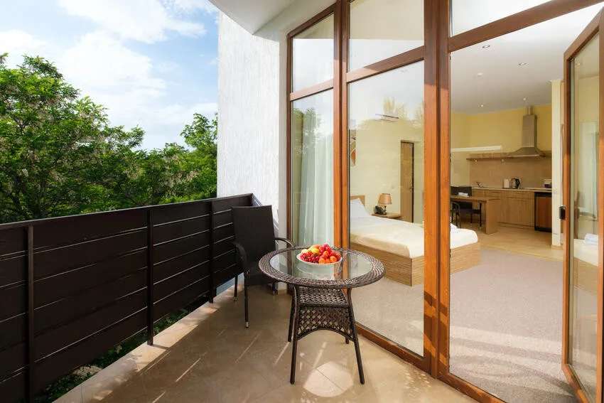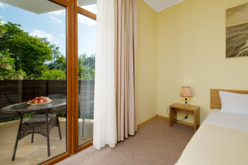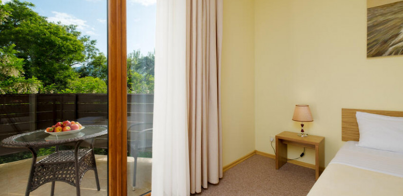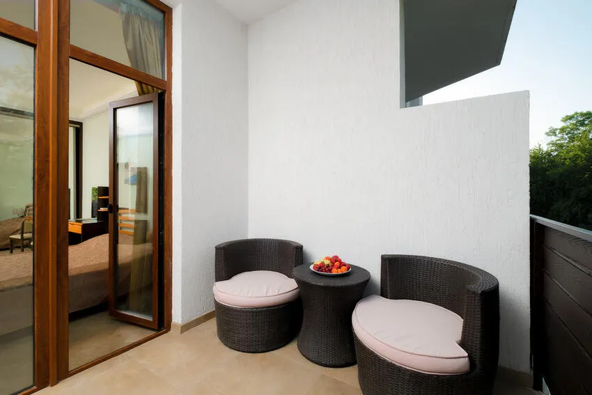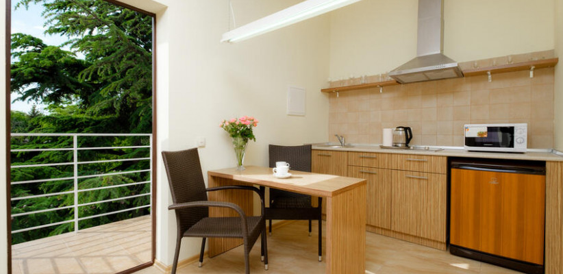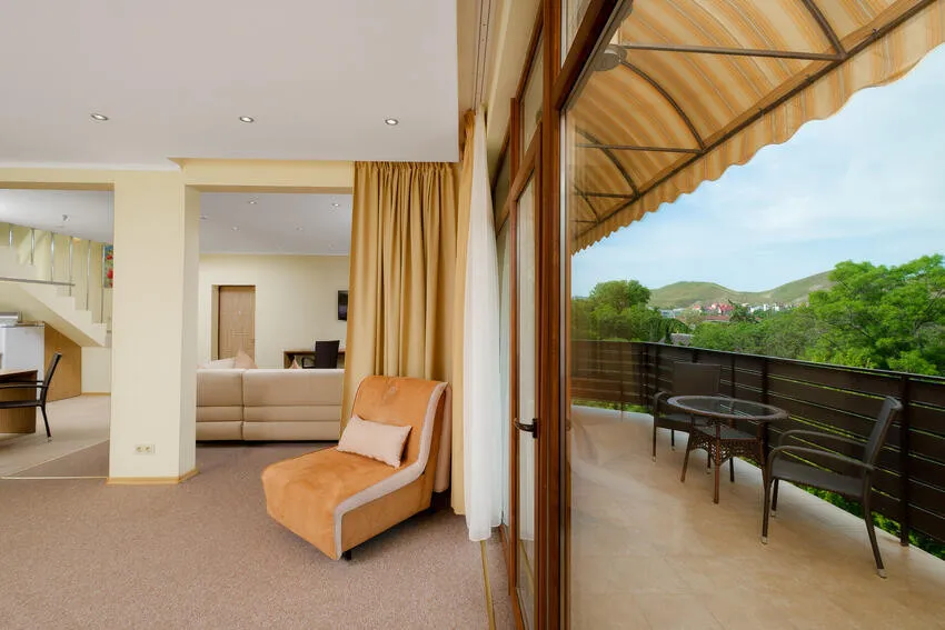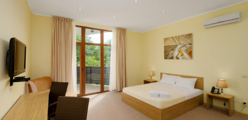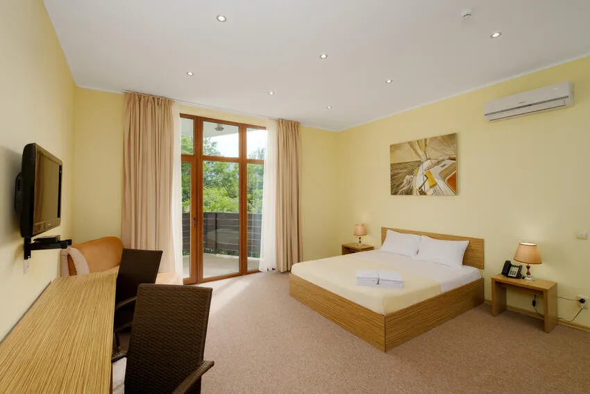 60 м2, балкон с видом на парк, горы и море, спальня с двуспальной кроватью, кресло, просторная гостиная зона, оборудованная кухня, рабочее место.Двухкомнатный люкс