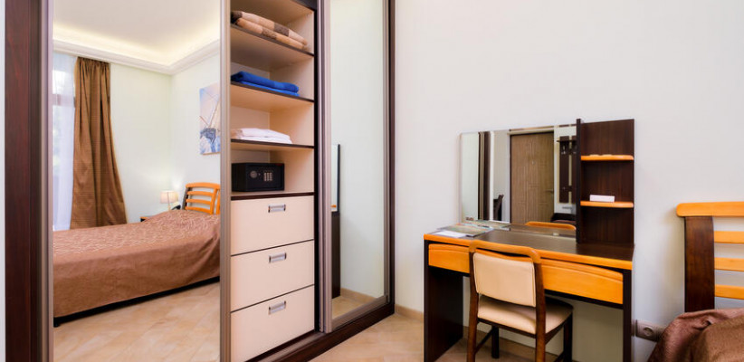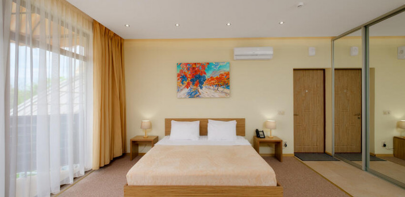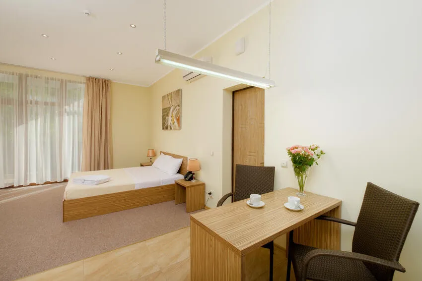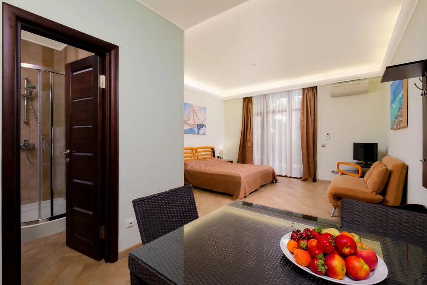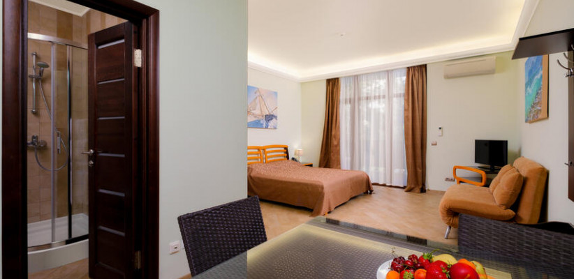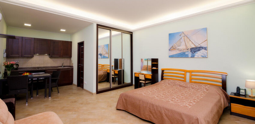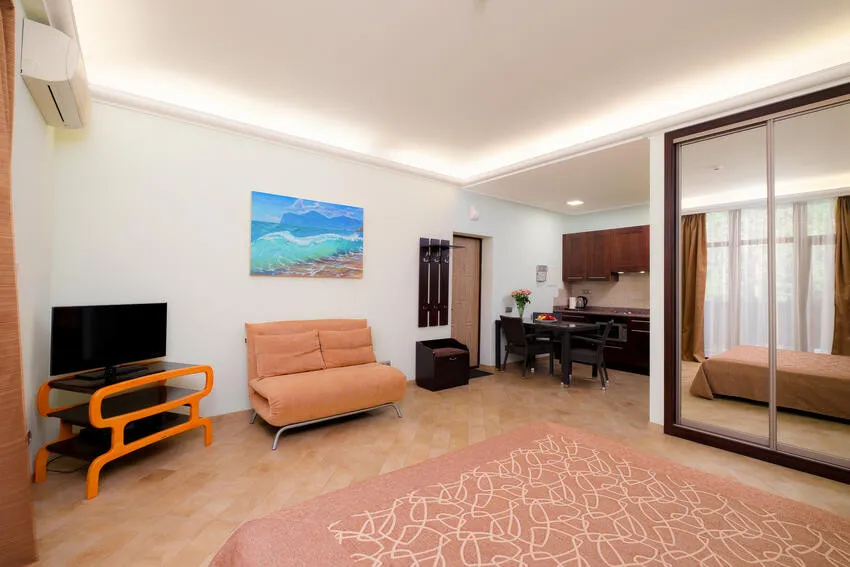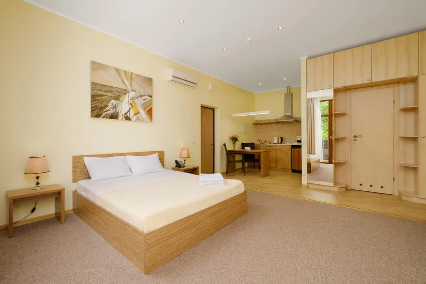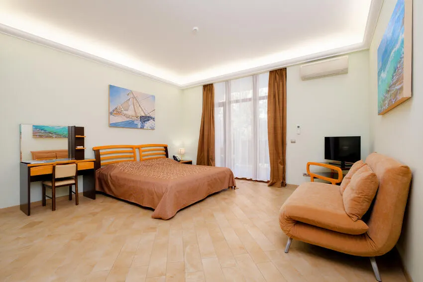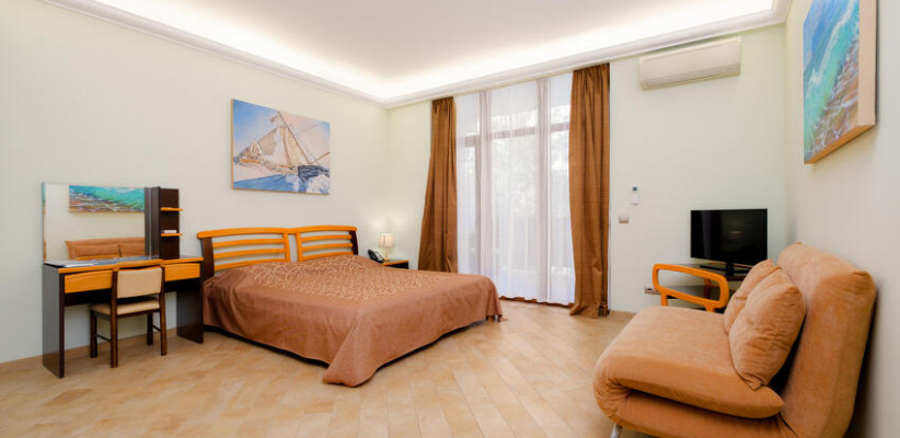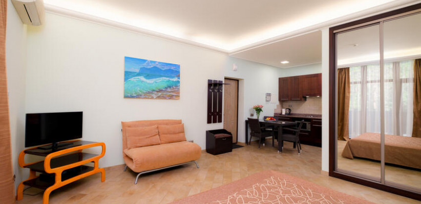 60 м2, с видом на парк, горы и море, спальня с двуспальной кроватью, кресло, отдельная гостиная, оборудованная кухня, рабочее место, гардероб.