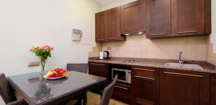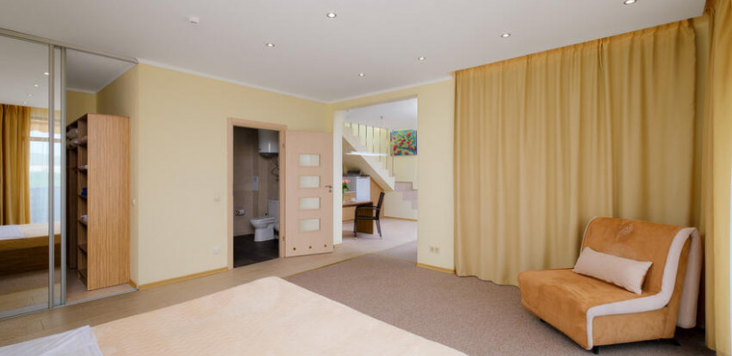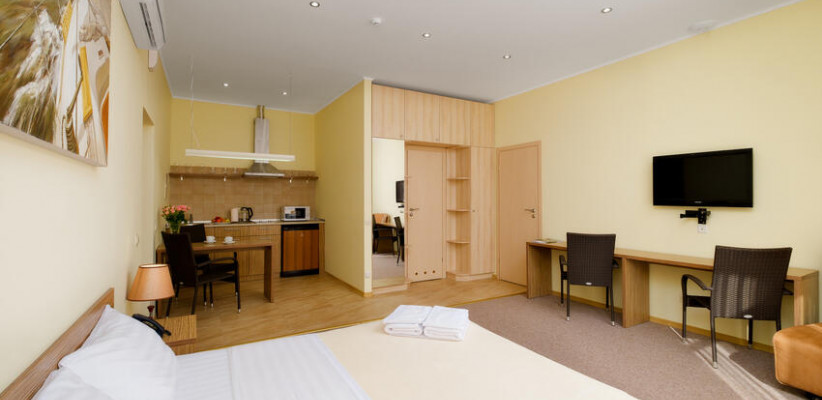60 м2, с видом на парк и горы, спальня с двуспальной кроватью, кресло, просторная гостиная зона, оборудованная кухня, рабочее место, гардероб.Апартаменты улучшенные