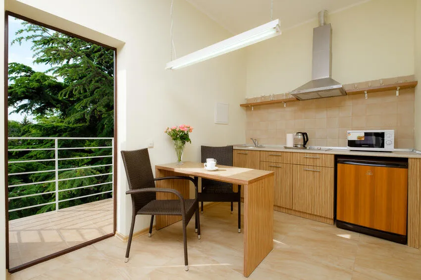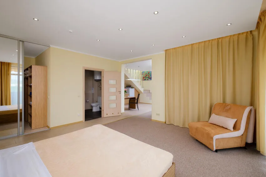 29 м2, панорамными окна и балкон, спальня с двуспальной кроватью, кресло, оборудованная кухня, рабочее место.Однокомнатный люкс