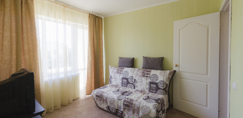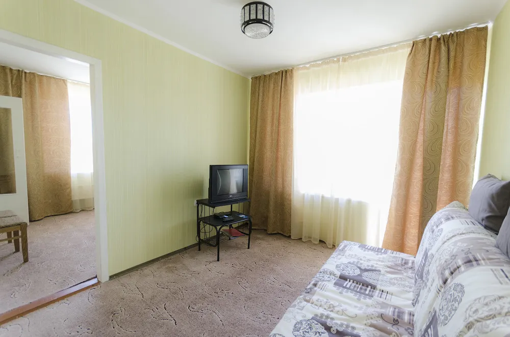30 м2, двуспальная кровать, отдельная гостиная с раскладным диваном, кухня, два балкона. Количество гостей: 2 + 3 доп. места (диван, евро-раскладушка)
