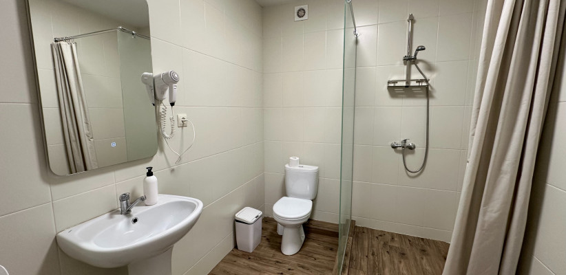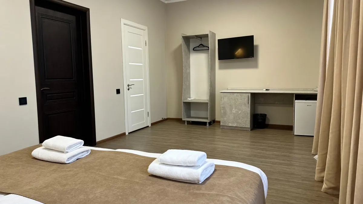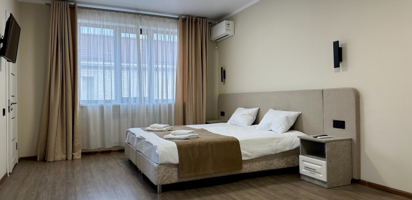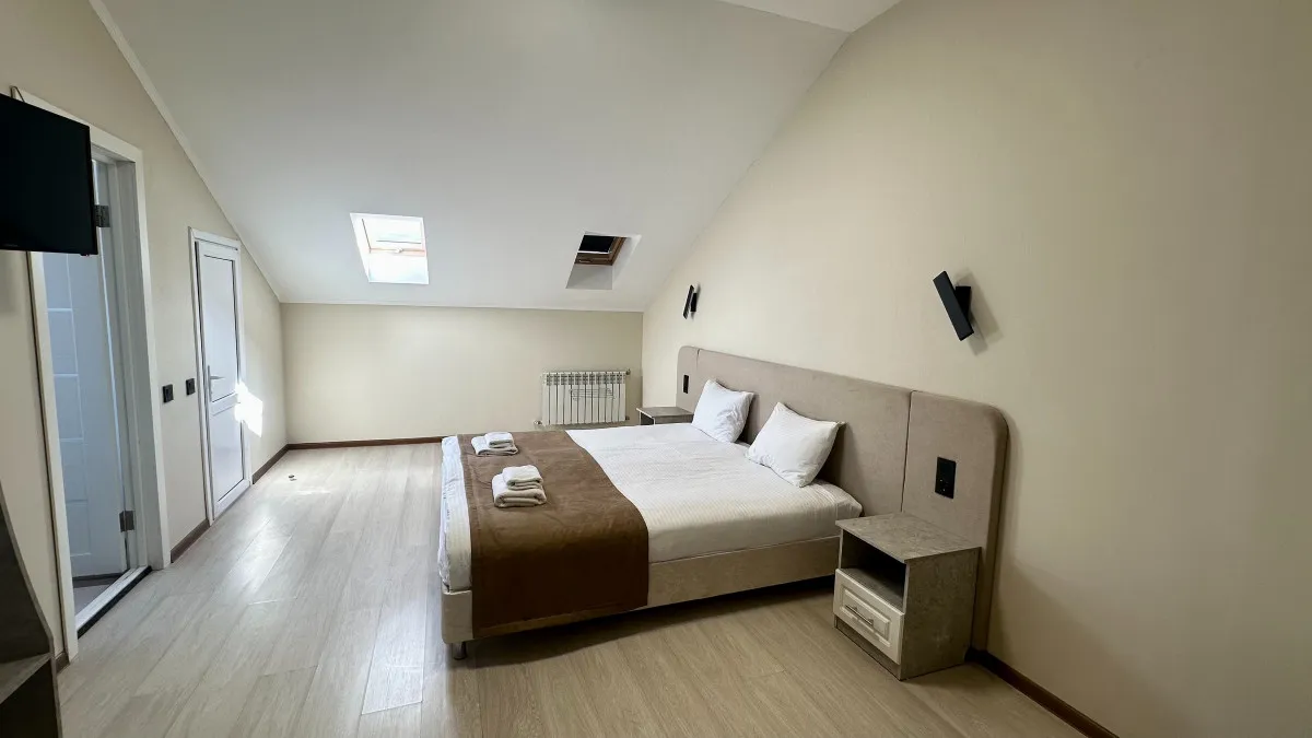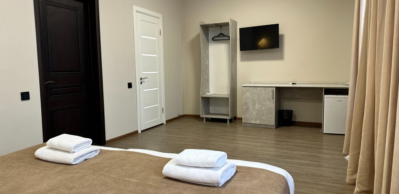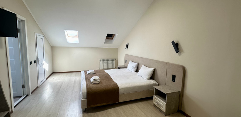 19 м2, разделяемая двуспальная кровать, доп. место. Количество гостей: 3Просторный стандарт с видом на горы
