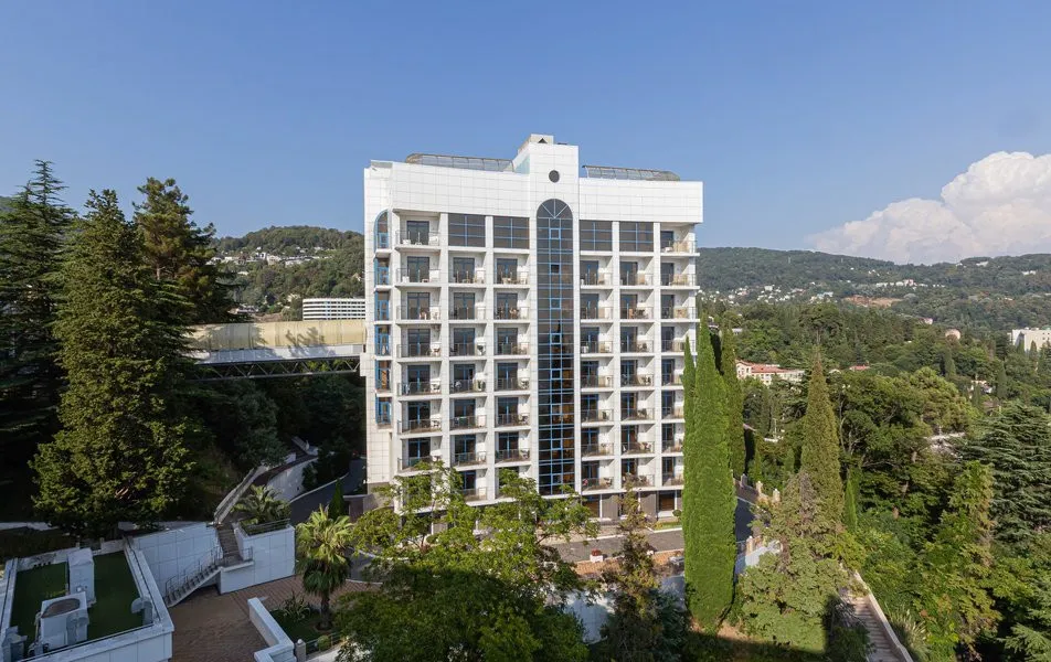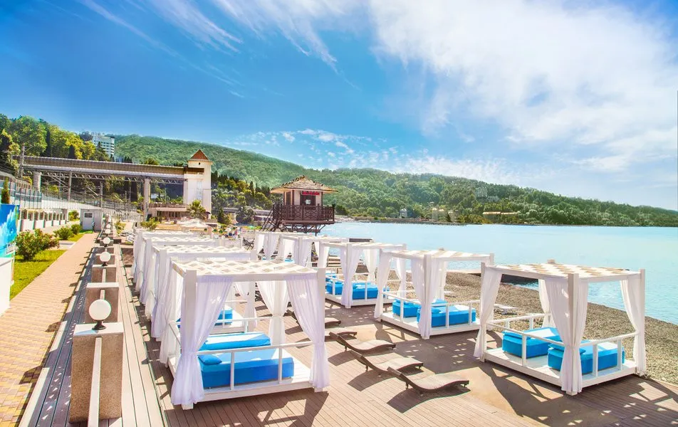 Собственный оборудованный пляж протяженностью 500 м с крупной и мелкой галькой, спуститься к которому можно на панорамном лифте. Пляж оборудован всем необходимым для полноценного отдыха.