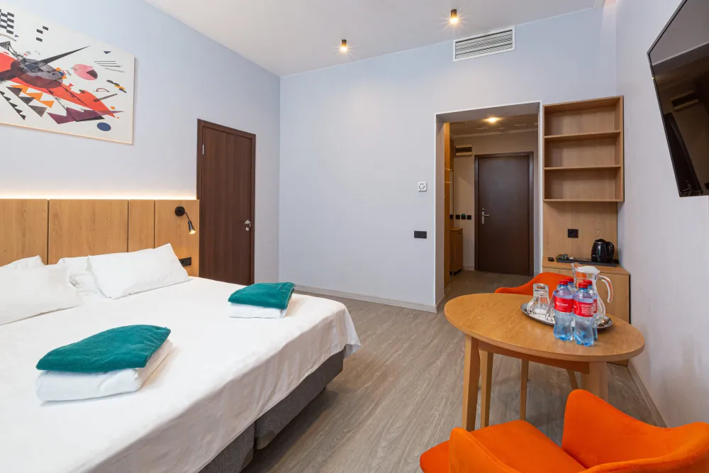 23 м2, вид на море или горы, две раздельные кровати с ортопедическими матрасами, балкон. Количество гостей: до 3Комфорт семейный 2-комнатный (Арена)