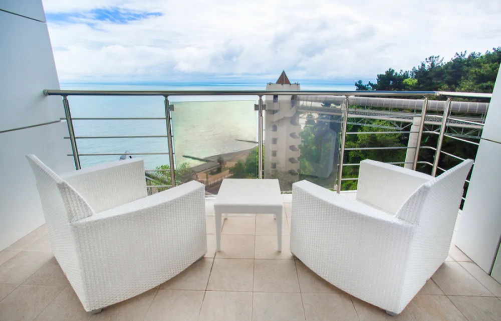 32 м2, вид на горную реку, в отдельной спальне — две односпальные кровати с ортопедическими матрасами, в гостиной — раскладной диван, балкон. Количество гостей: до 4Студия семейная с видом на море без балкона (Салют)
