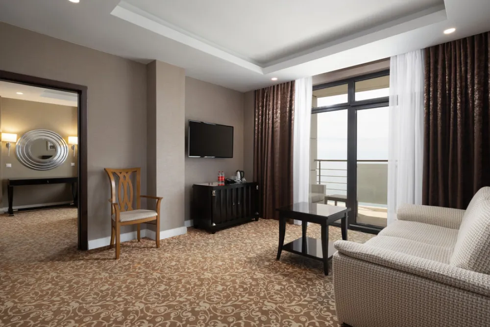 43 м2, вид на море и парк, большая двуспальная или две раздельные кровати с ортопедическими матрасами, а также диван. Количество гостей: до 4Люкс семейный 2-комнатный (Салют)