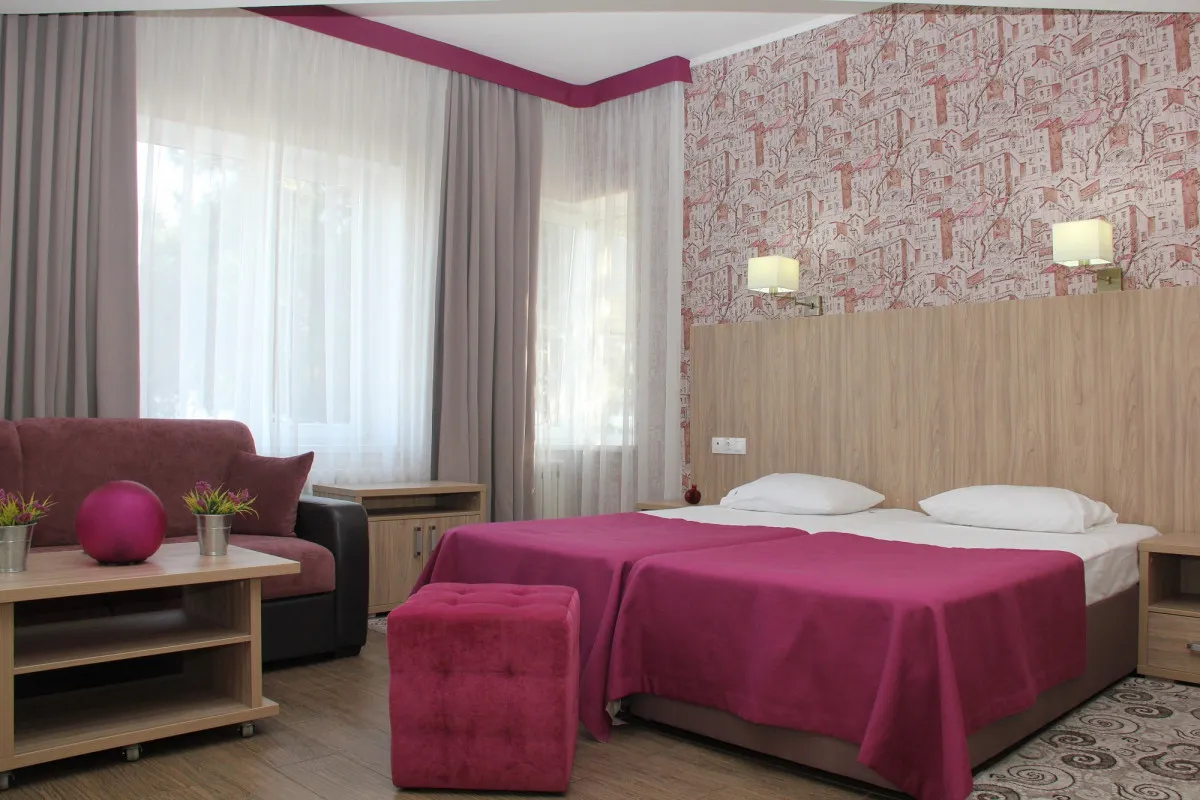 15-18 м2, Номер состоит из одной или двух комнат (комната с двумя односпальными кроватями + комната с диваном). Номера с дополнительными местами (кресло-кровать или диван-кровать). Количество гостей: 3Двухместный 1 категории (Корпус ЧИLL)