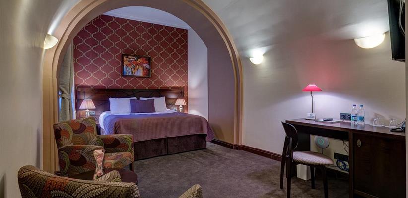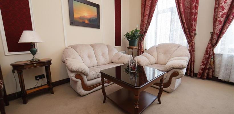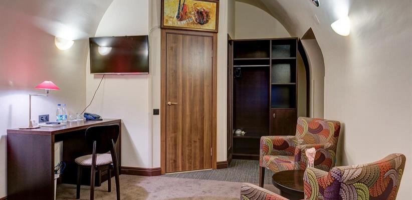 Люкс – 55 кв. м, максимальное размещение 4 человека. В двухкомнатном номере есть гостиная зона, рабочий уголок и спальня. Возможно размещение дополнительного спального места.