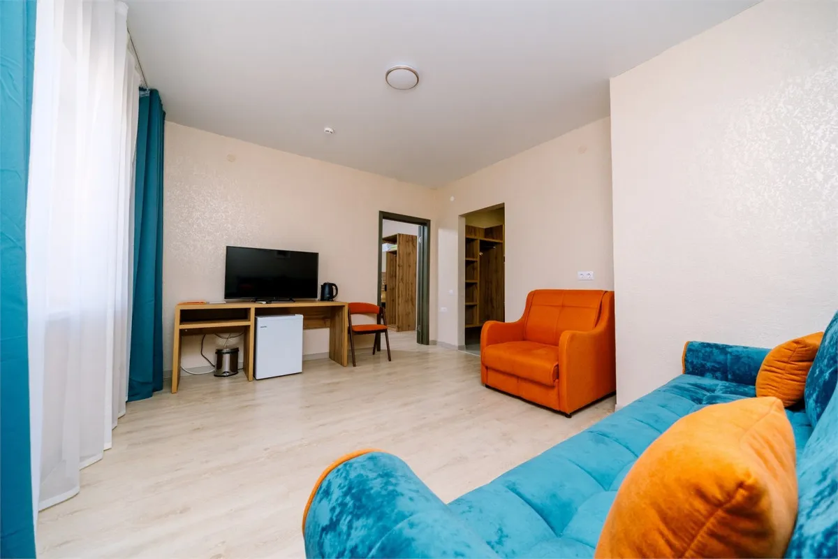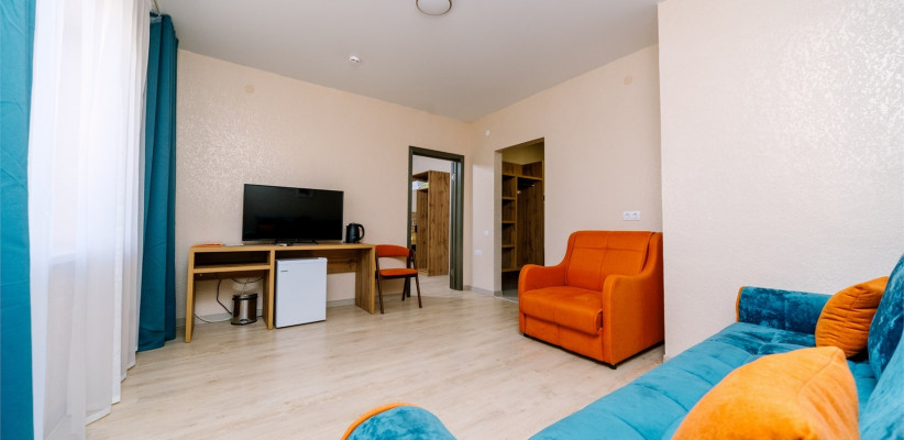 28 м2, спальня, гостиная, двуспальная кровать, диван-кровать, кресло-кровать, балкон. Количество гостей: 5Семейный 4-местный 2-комнатный (с балконом)