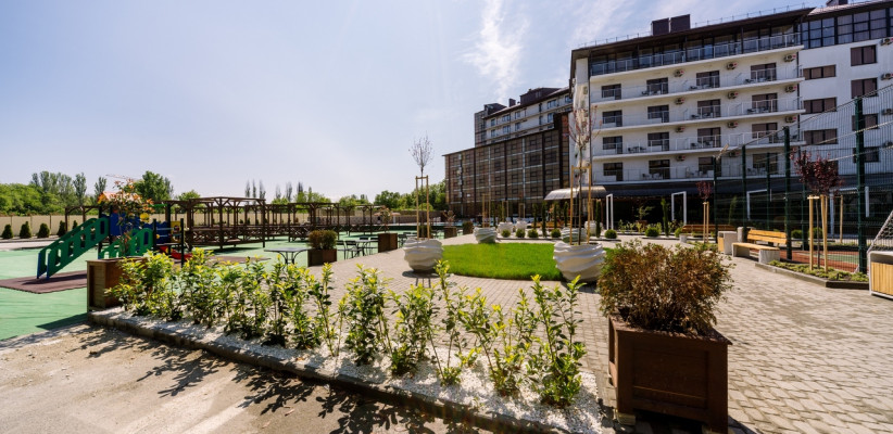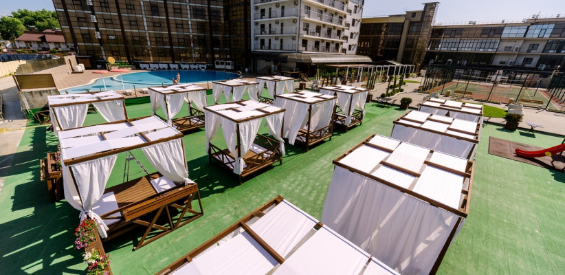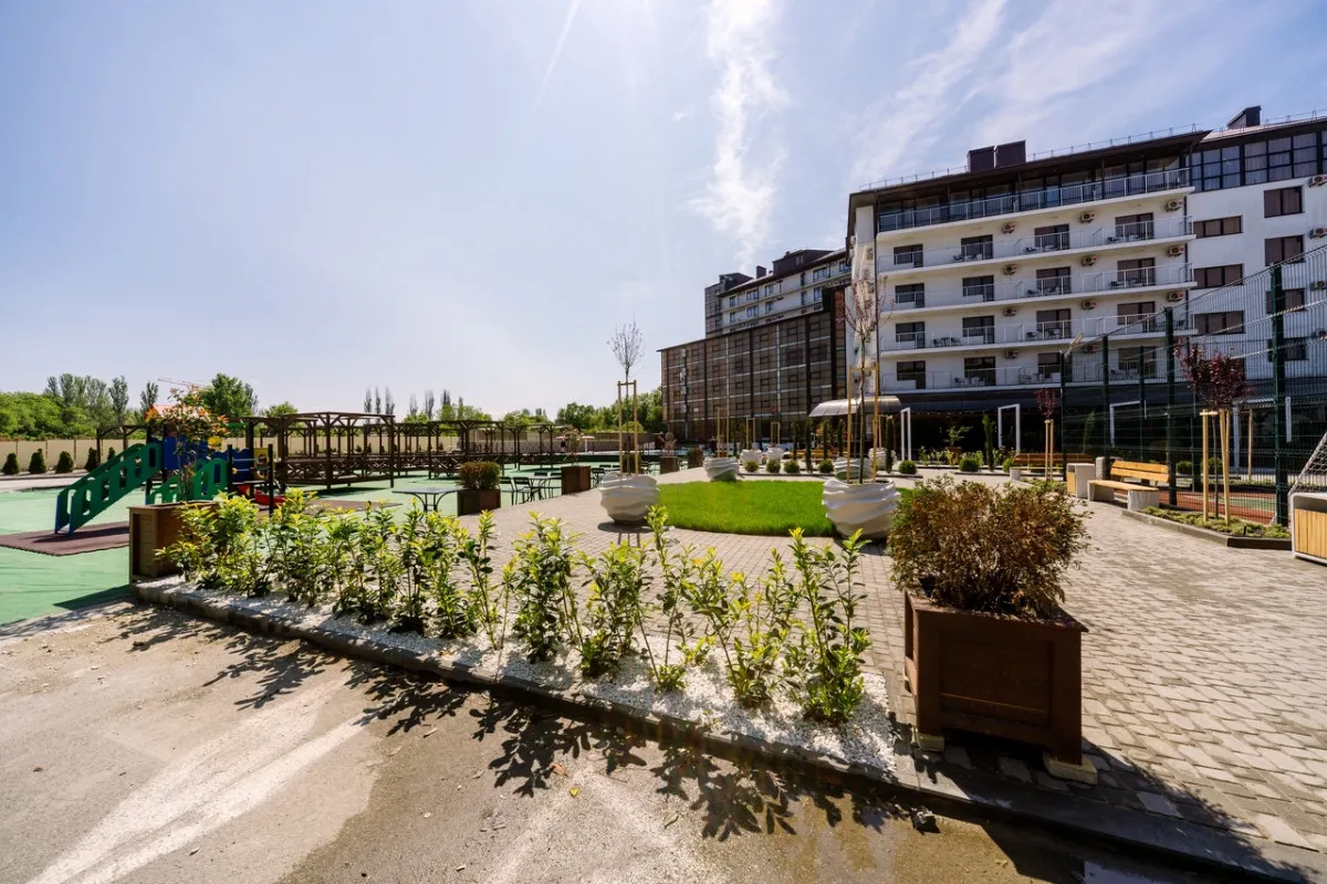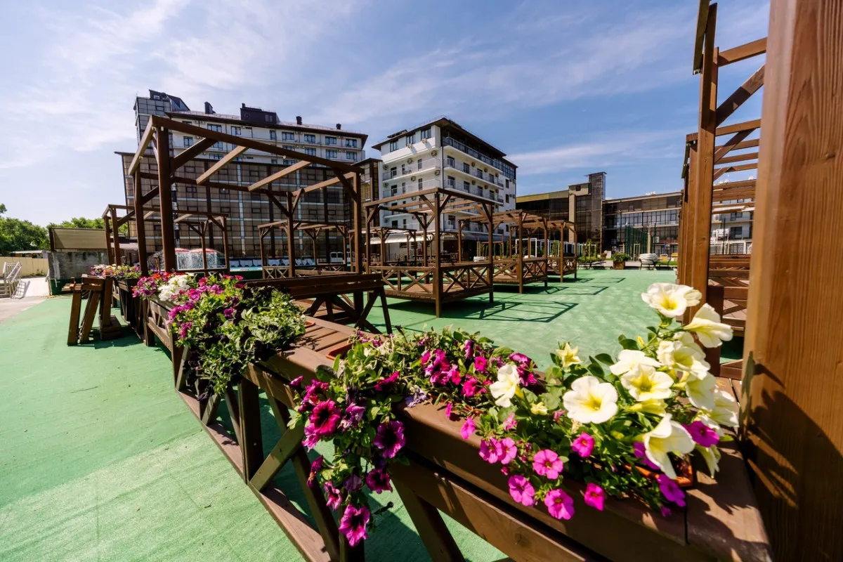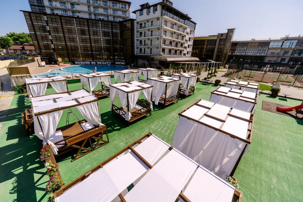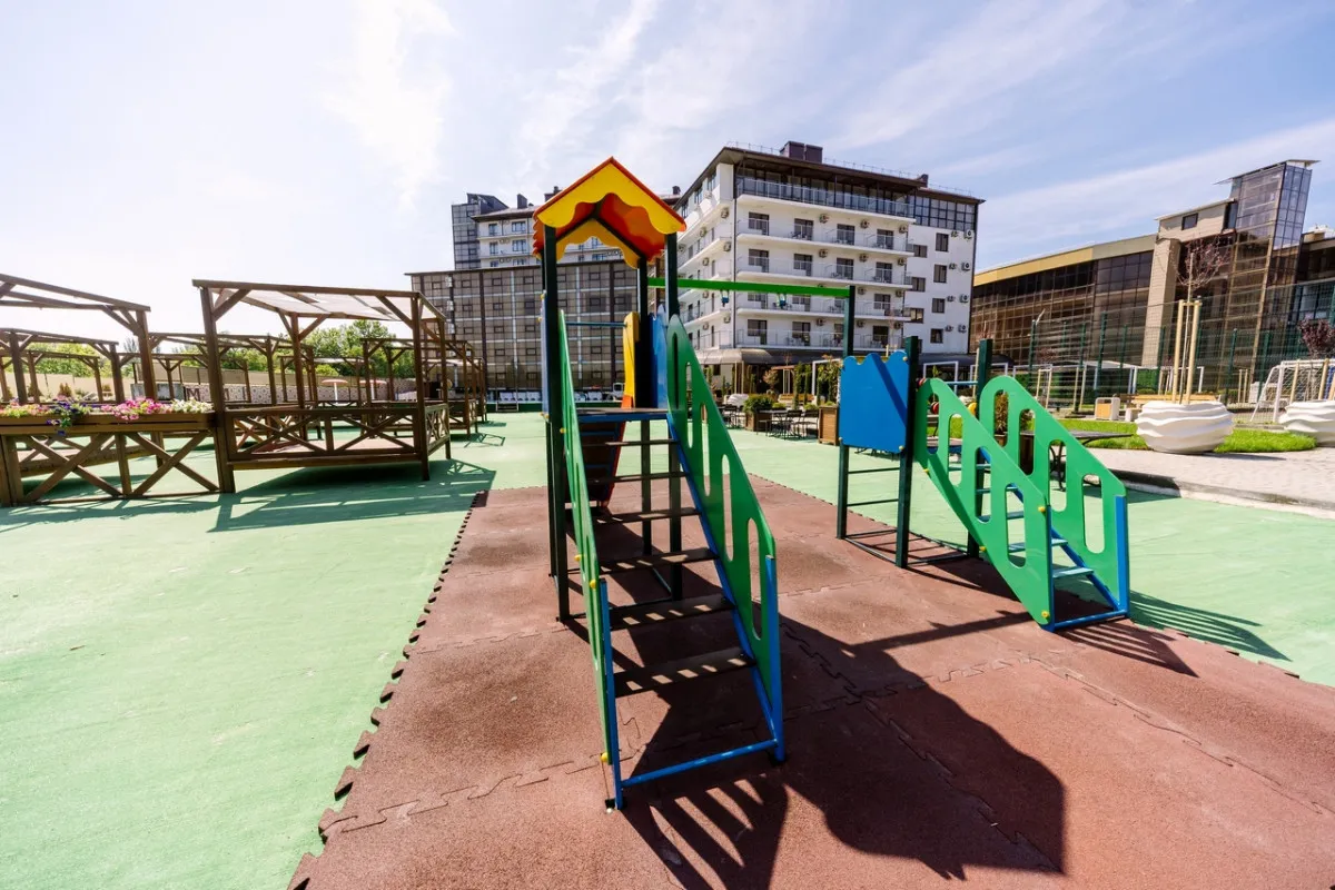 Территория отеля благоустроена и ориентирована на комфортный отдых: предусмотрены зоны для досуга, бассейн и пространства для игр.