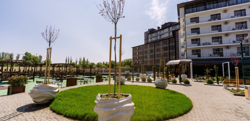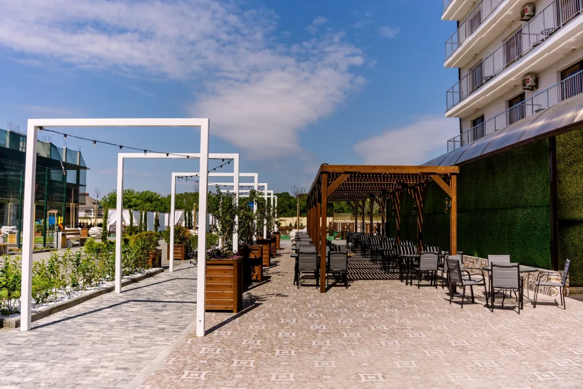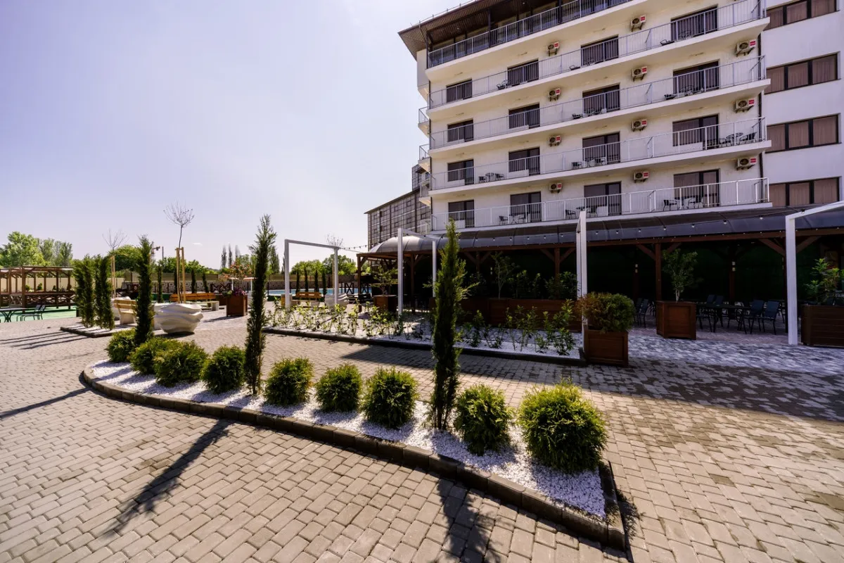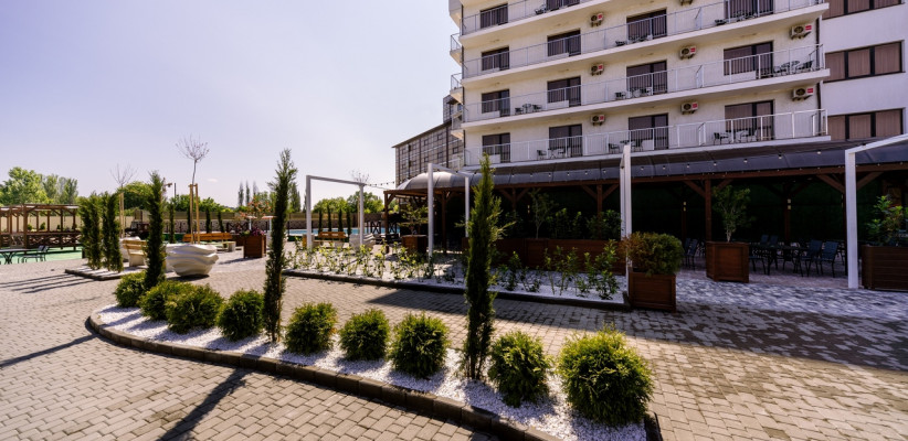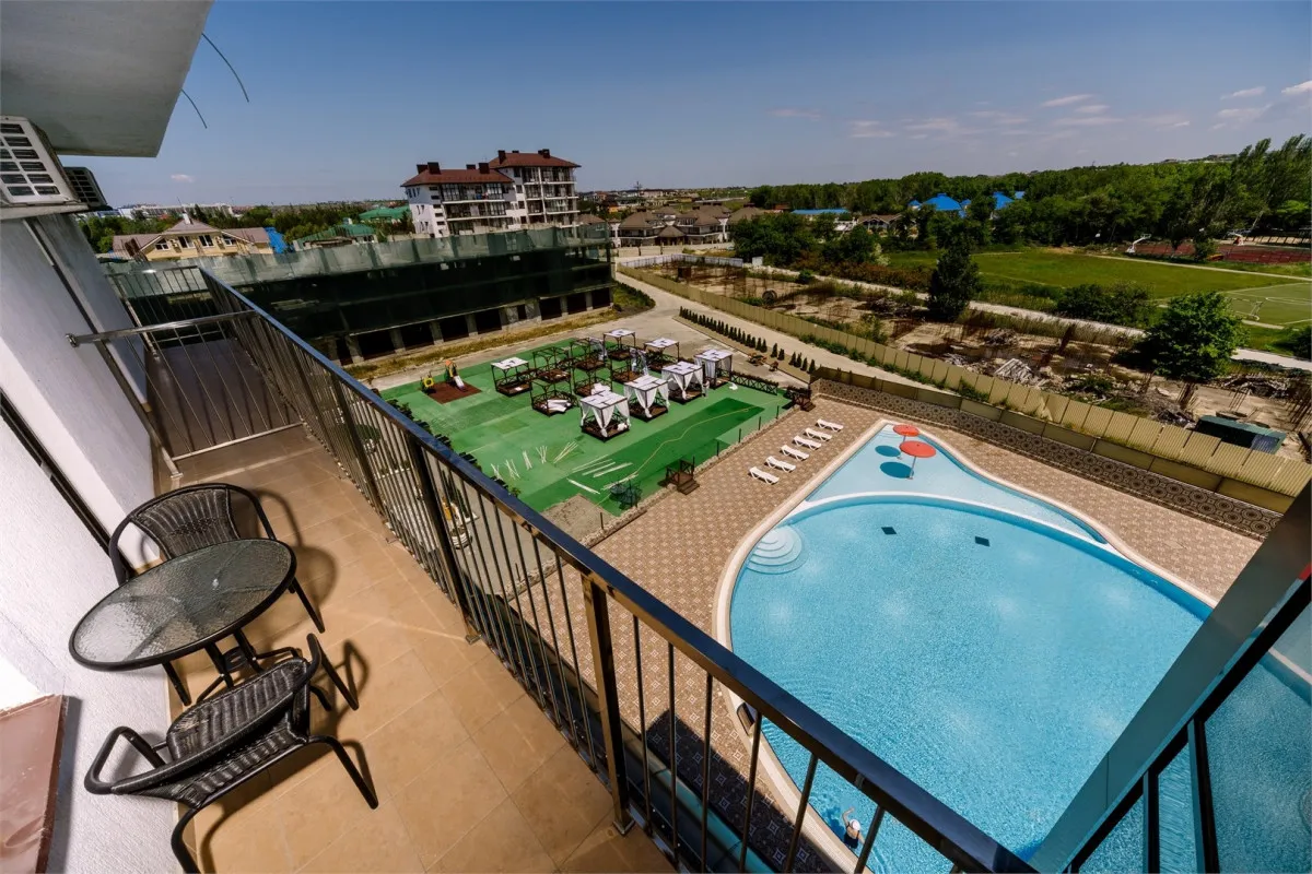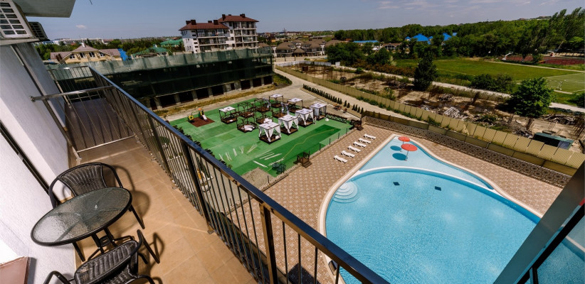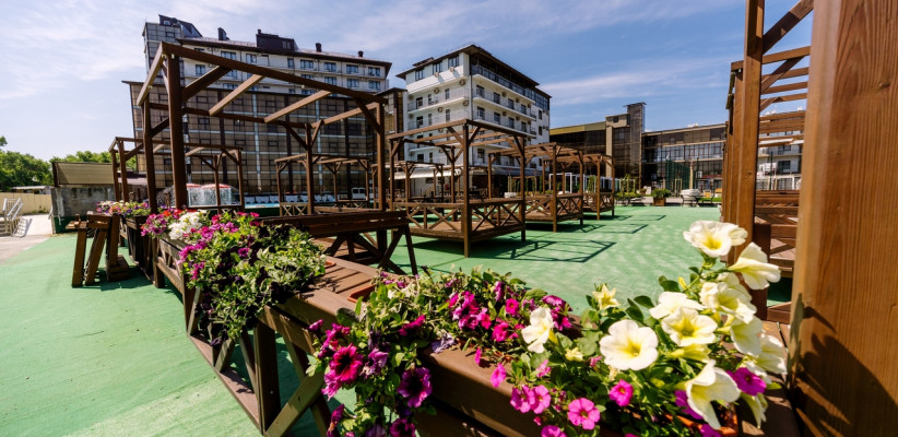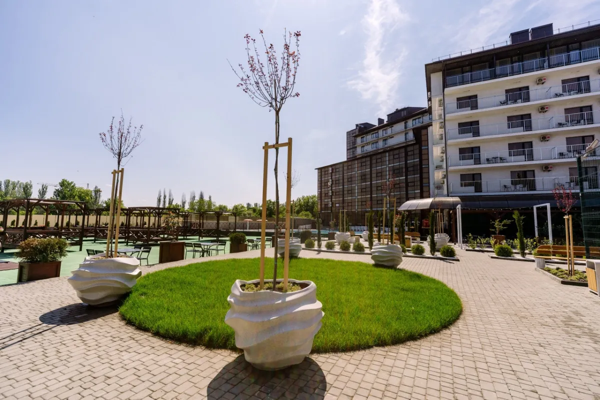 Территория отеля благоустроена и ориентирована на комфортный отдых: предусмотрены зоны для досуга, бассейн и пространства для игр.
