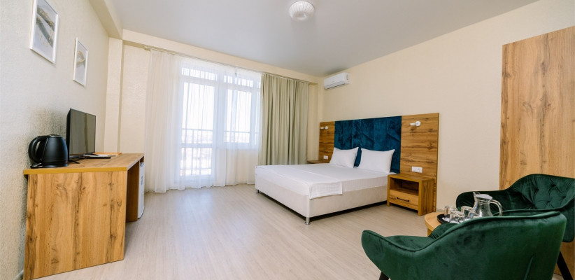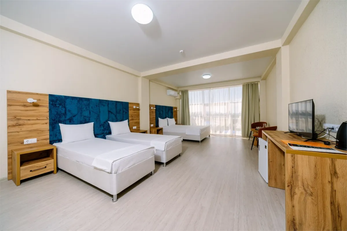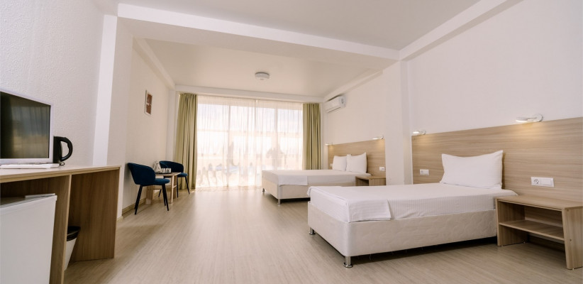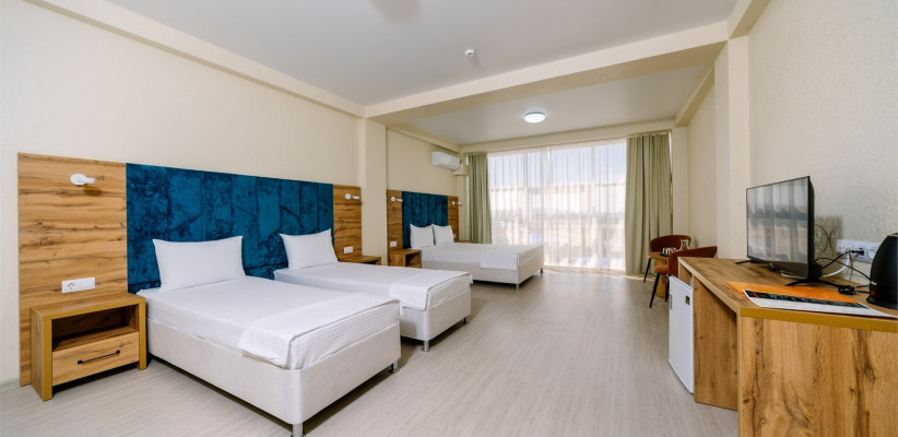 30 м2, двуспальная кровать и две односпальные. Количество гостей: 4Семейный 4-местный (панорамный, вид на море)