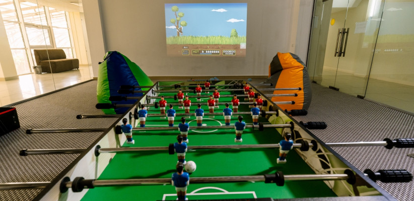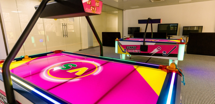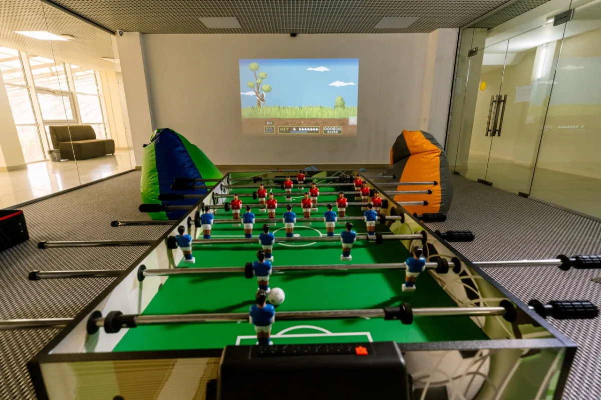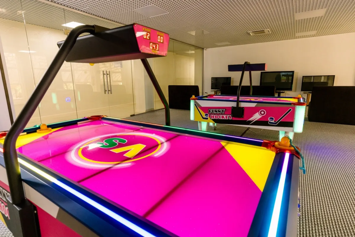 - игровая комната с аэрохоккеем, приставками и сенсорной панелью с играми