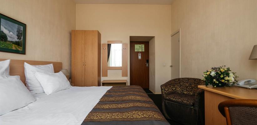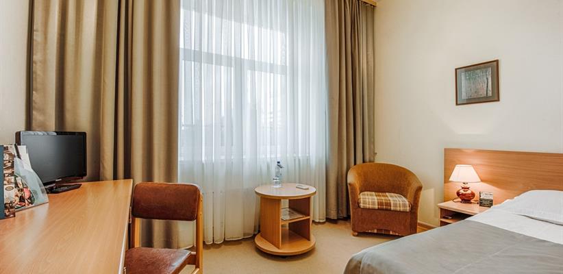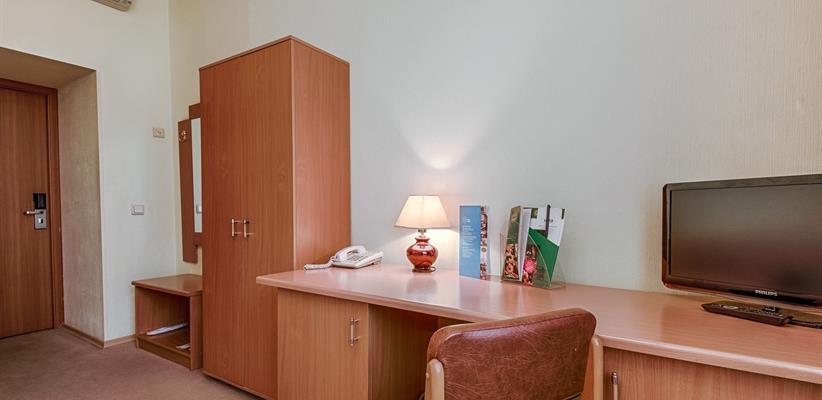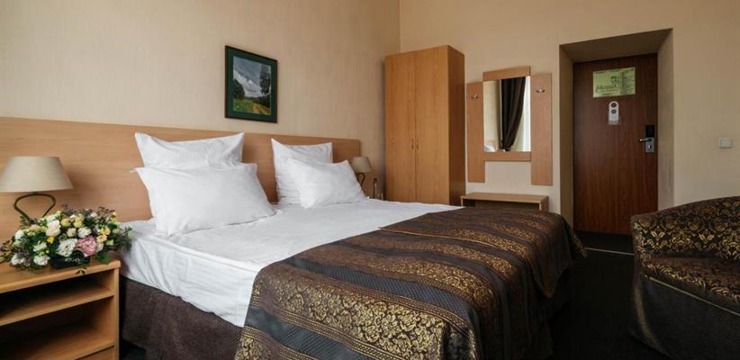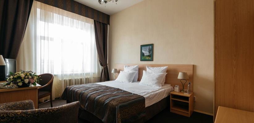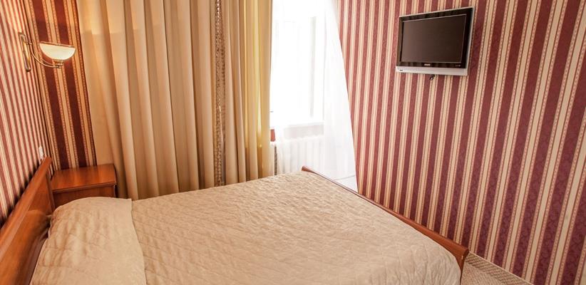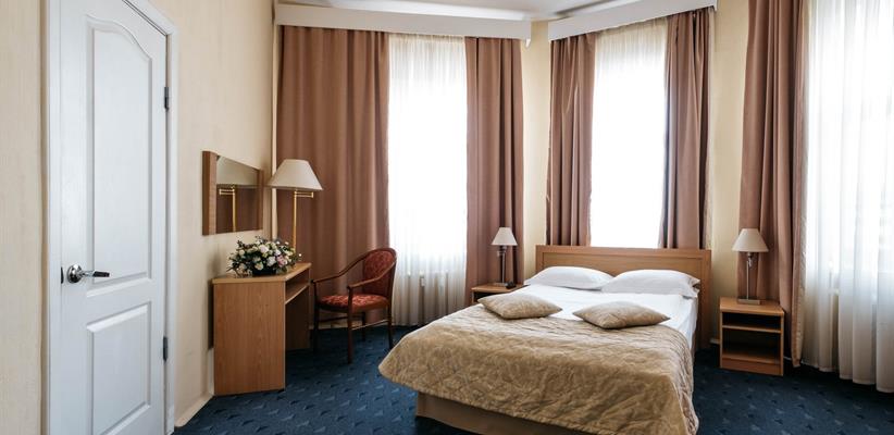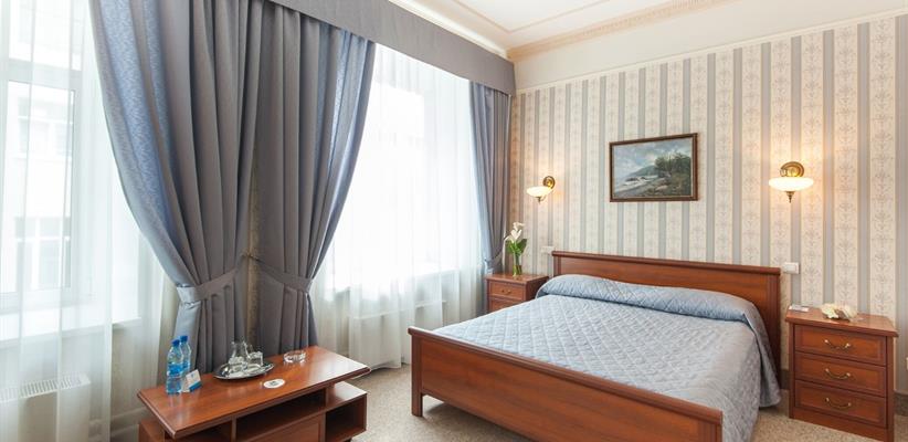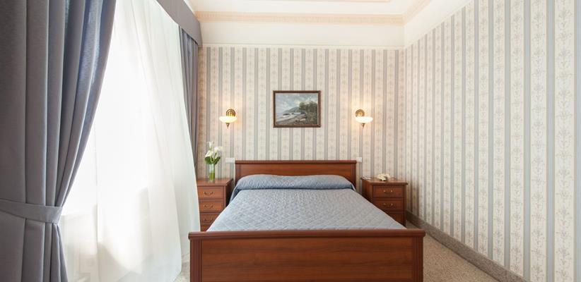 Одноместный улучшенный – 20 кв.м., до 2 гостей, в номере есть двуспальная кровать, кондиционер, телевизор, телефон, интернет и собственная ванная комната с душем и феном.