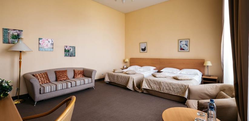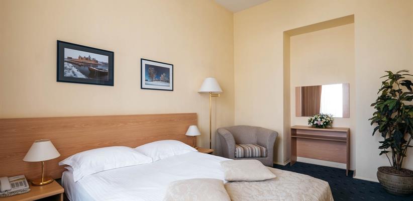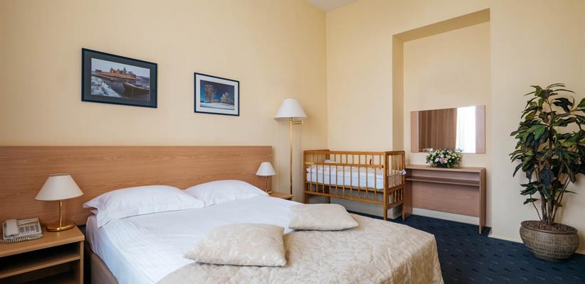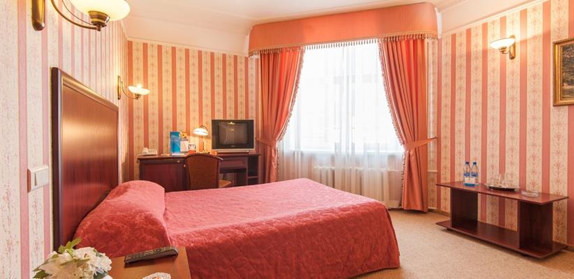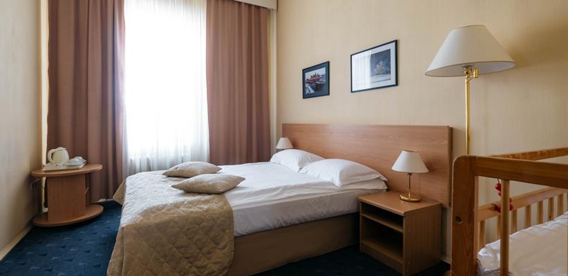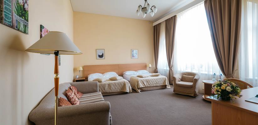 Стандарт двухместный – 26 кв.м., до 2 гостей, в номере есть две односпальные кровати, телевизор, телефон, интернет и собственная ванная комната с душем. Есть возможность поставить дополнительное место.