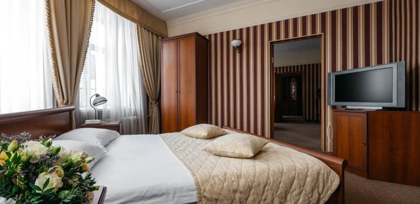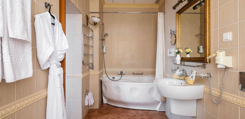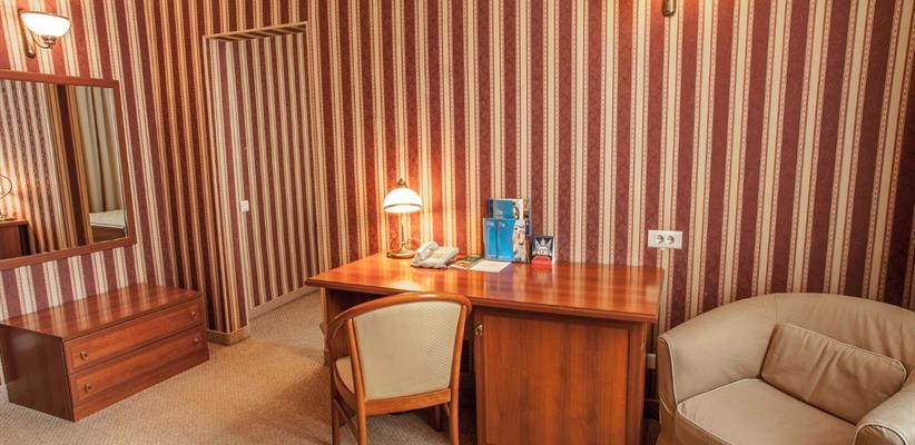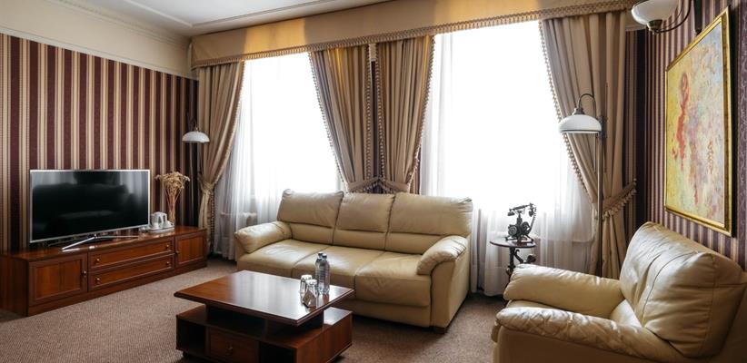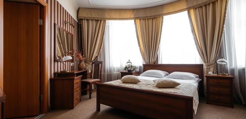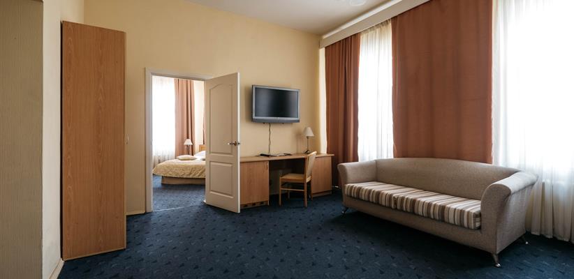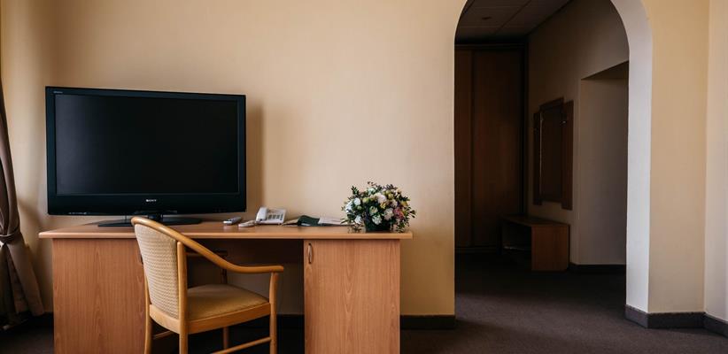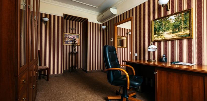 Люкс – 58 кв.м., 3 комнаты, в номере есть двуспальная кровать, кондиционер, телевизор, телефон, интернет и собственная ванная комната с душем и феном, зона для работы.