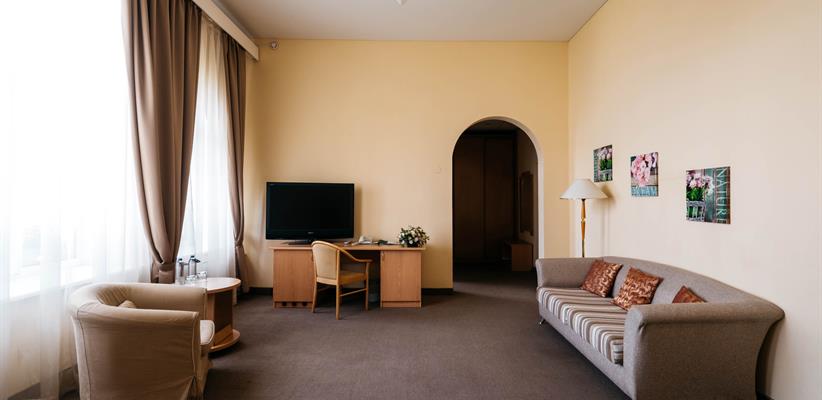 Джуниор Сюит – 30 кв.м., 2 комнаты, в номере есть двуспальная кровать, кондиционер, телевизор, телефон, интернет и собственная ванная комната с душем и феном, зона для работы.