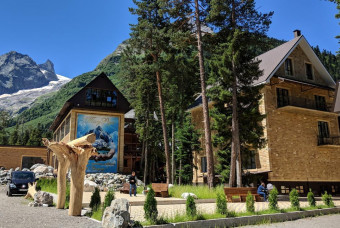Удачное расположение отеля от канатных дорог. Центр поселка Домбай.