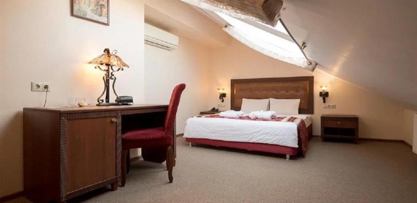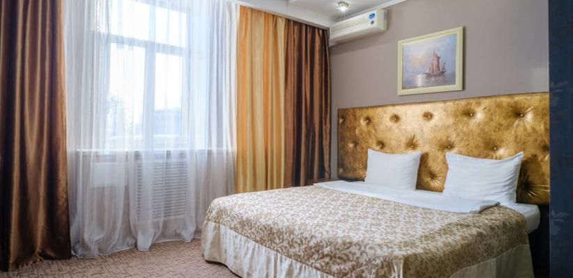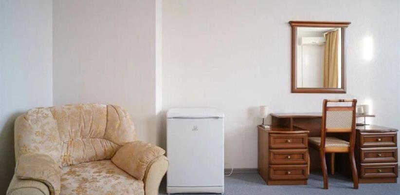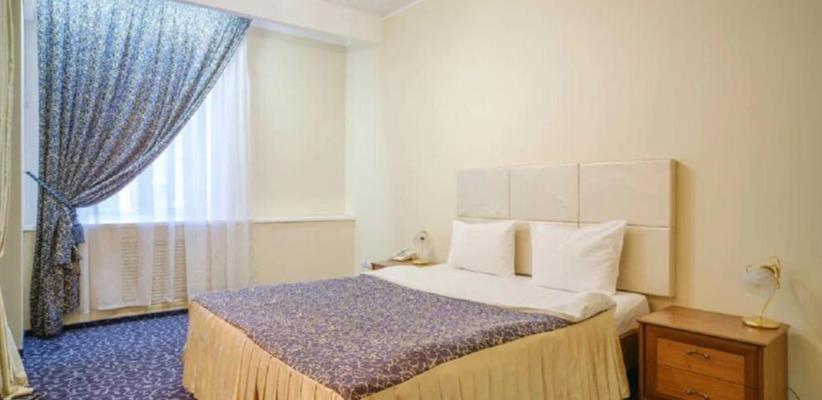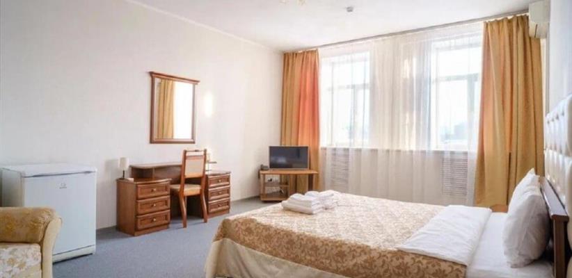 Двухместный номер «ДеЛюкс» двухкомнатный площадью 30 кв. м. В номере одна двуспальная кровать 180 см х 200 см. Максимальное количество проживающих – 2 человека.