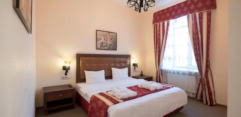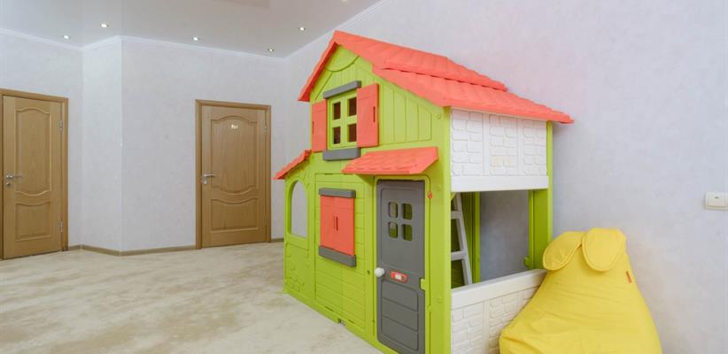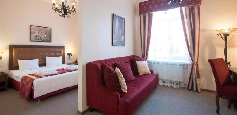 Семейный номер «ДеЛюкс» двухкомнатный площадью 45 кв. м. В номере одна двуспальная кровать 180 см х 200 см. Максимальное количество проживающих – 4 человека.