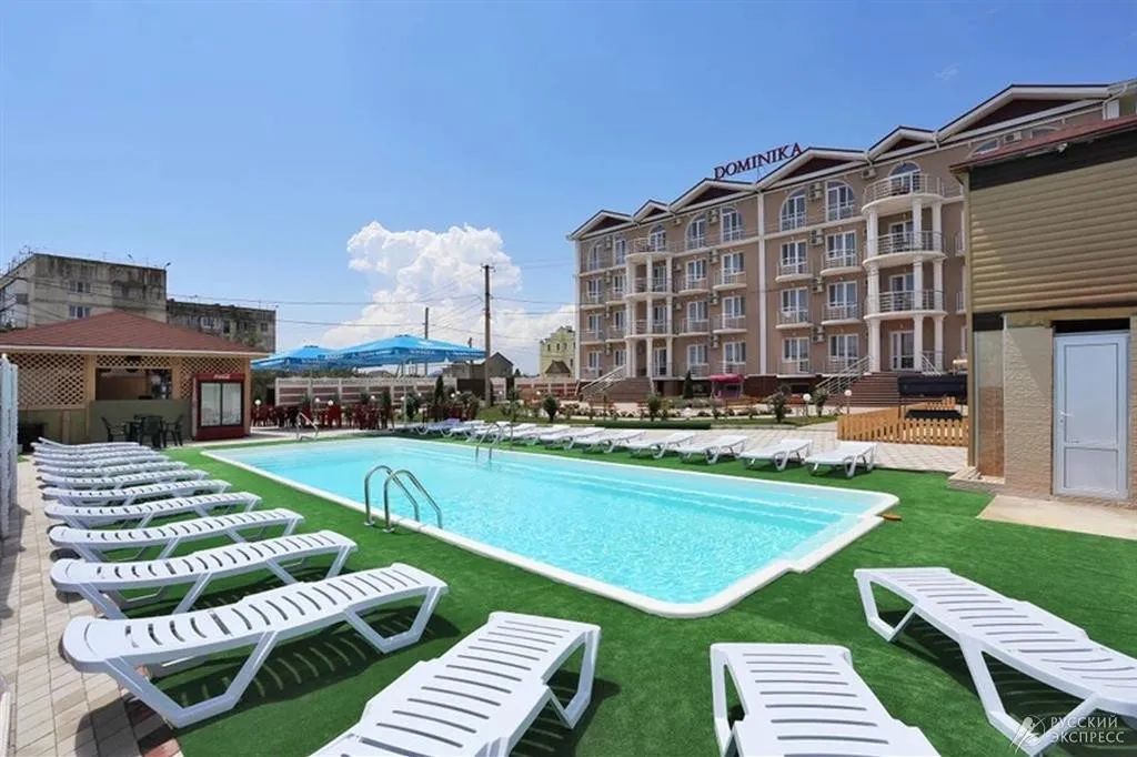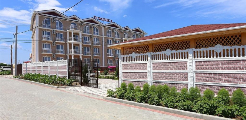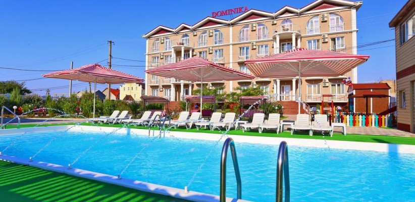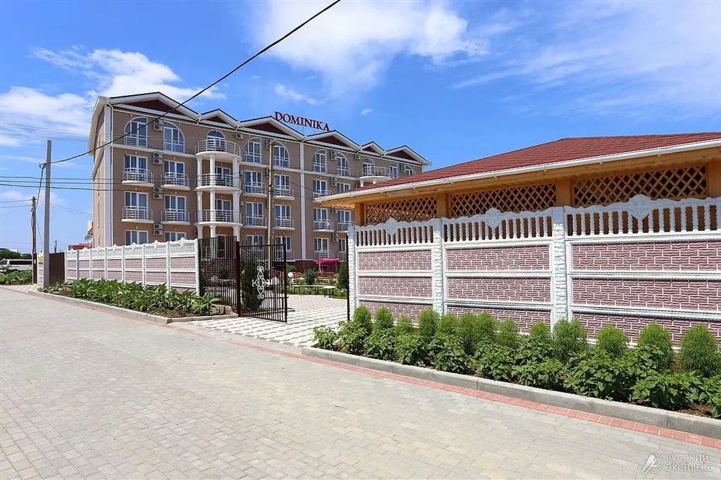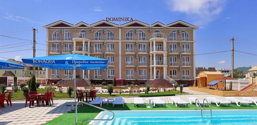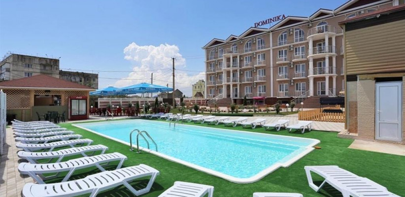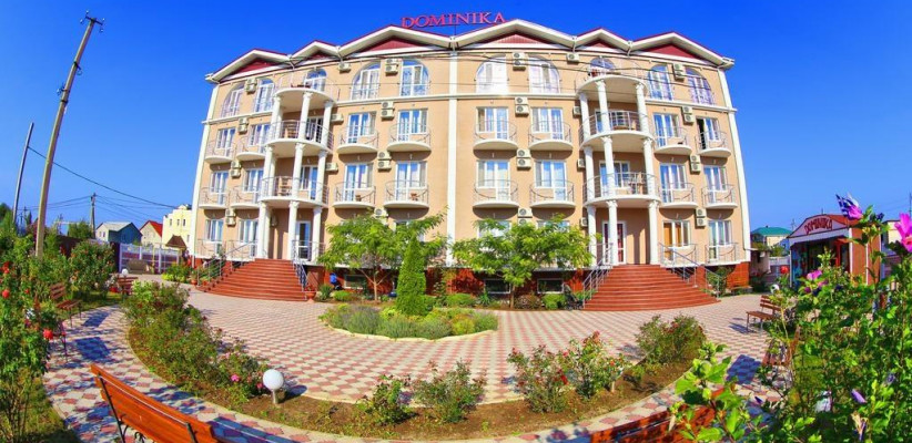 Гостевой дом «Доминика» — современное четырехэтажное здание с легкими открытыми балконами и комфортабельными номерами. На первом этаже расположена круглосуточная стойка приема и размещения. Территория озеленена, закрыта для посторонних, охраняется круглосуточно. На территории оборудована зона отдыха с открытым подогреваемым бассейном, теневым навесом с шезлонгами, детским бассейном и игровой площадкой. Так же на территории есть небольшое кафе и площадки для анимации. Гостевой дом имеет собственную бесплатную парковку.