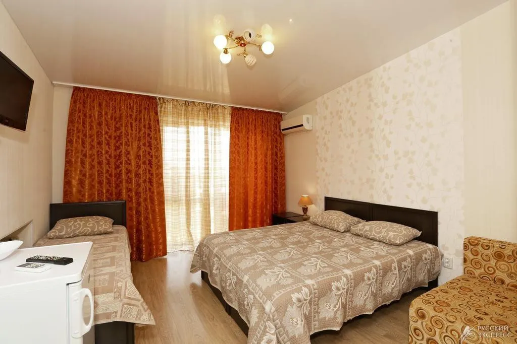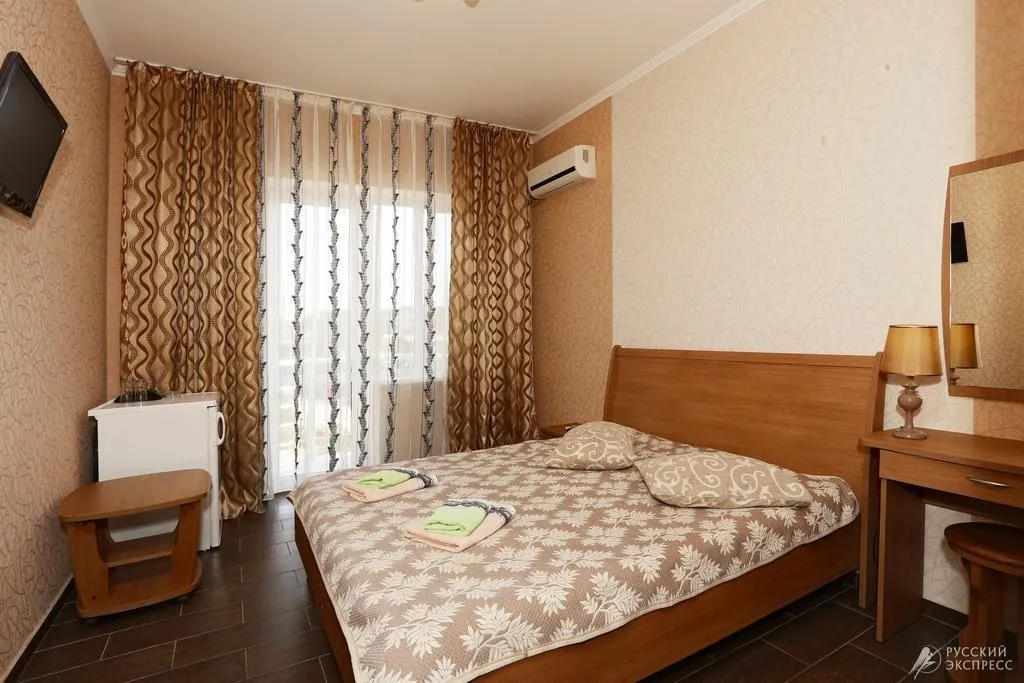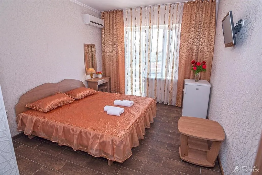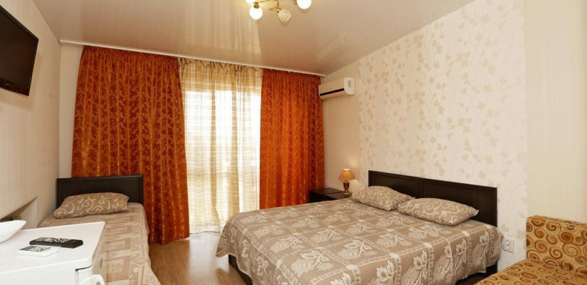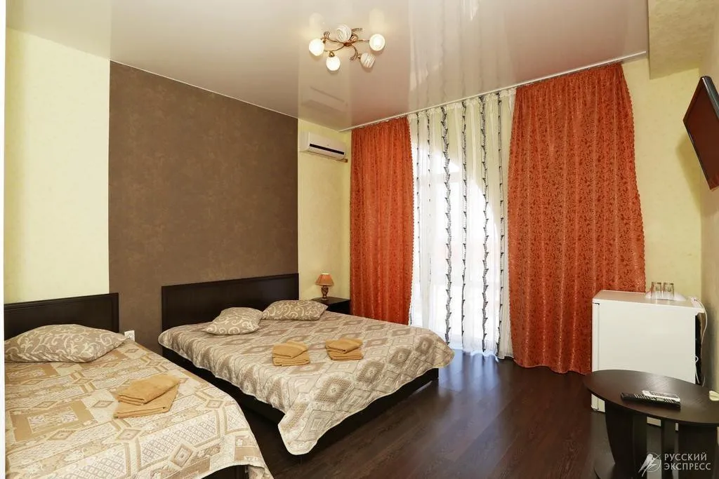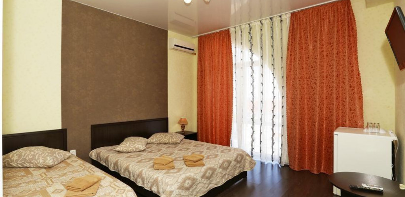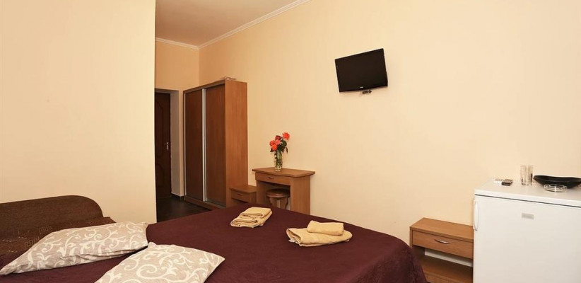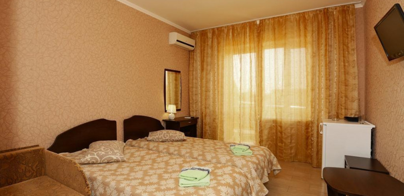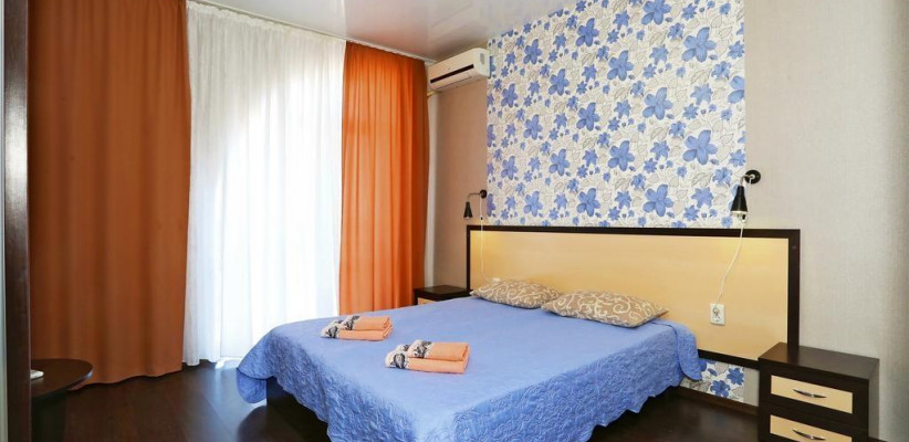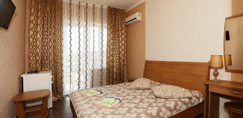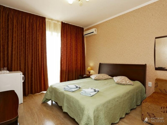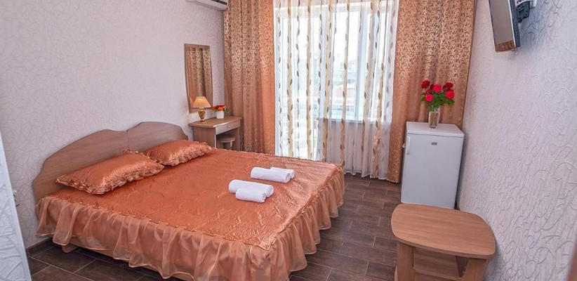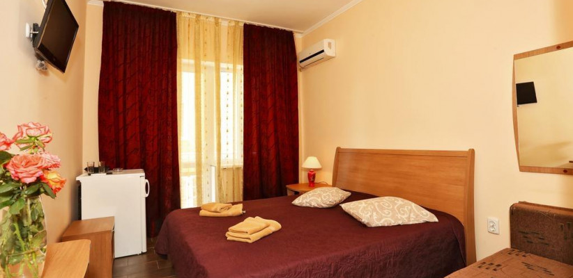 - Люкс (35 кв. м, 2 чел. + 3 доп. места — двуспальный диван + раскладное кресло) — просторный двухкомнатный номер с большой двуспальной кроватью и двуспальным раскладным диваном. С прекрасной террасой, комплектом летней мебели и видом на поселок и море. В номере: туалетный столик, зеркало, ТВ, кондиционер, прикроватная тумбочка, бра, шкаф с мини-сейфом, двуспальный раскладной диван, раскладное кресло, журнальный столик, холодильник. Санузел: зеркало, раковина, душевая кабина, унитаз. Есть балкон