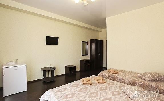 - 4-местный стандарт (24 кв. м, 4 чел., без доп. мест) — просторный четырехместный номер с 4 односпальными кроватями. В номере: прикроватные тумбочки, зеркало, туалетный столик, пуфик, холодильник, ТВ, шкаф с мини-сейфом, журнальный столик. Санузел: раковина, душевая кабина, унитаз