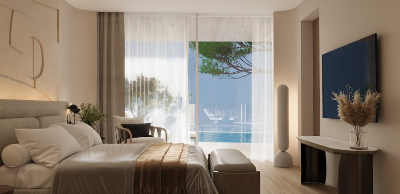160 м2, двуспальная кровать размера «king-size», отдельная гостиная, просторная терраса с частным бассейном и панорамным видом на море. Количество гостей: 4Люкс с приватным бассейном
