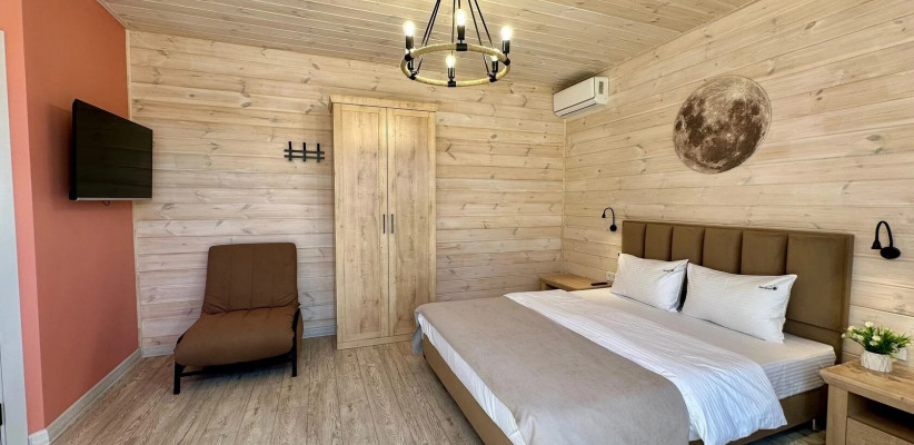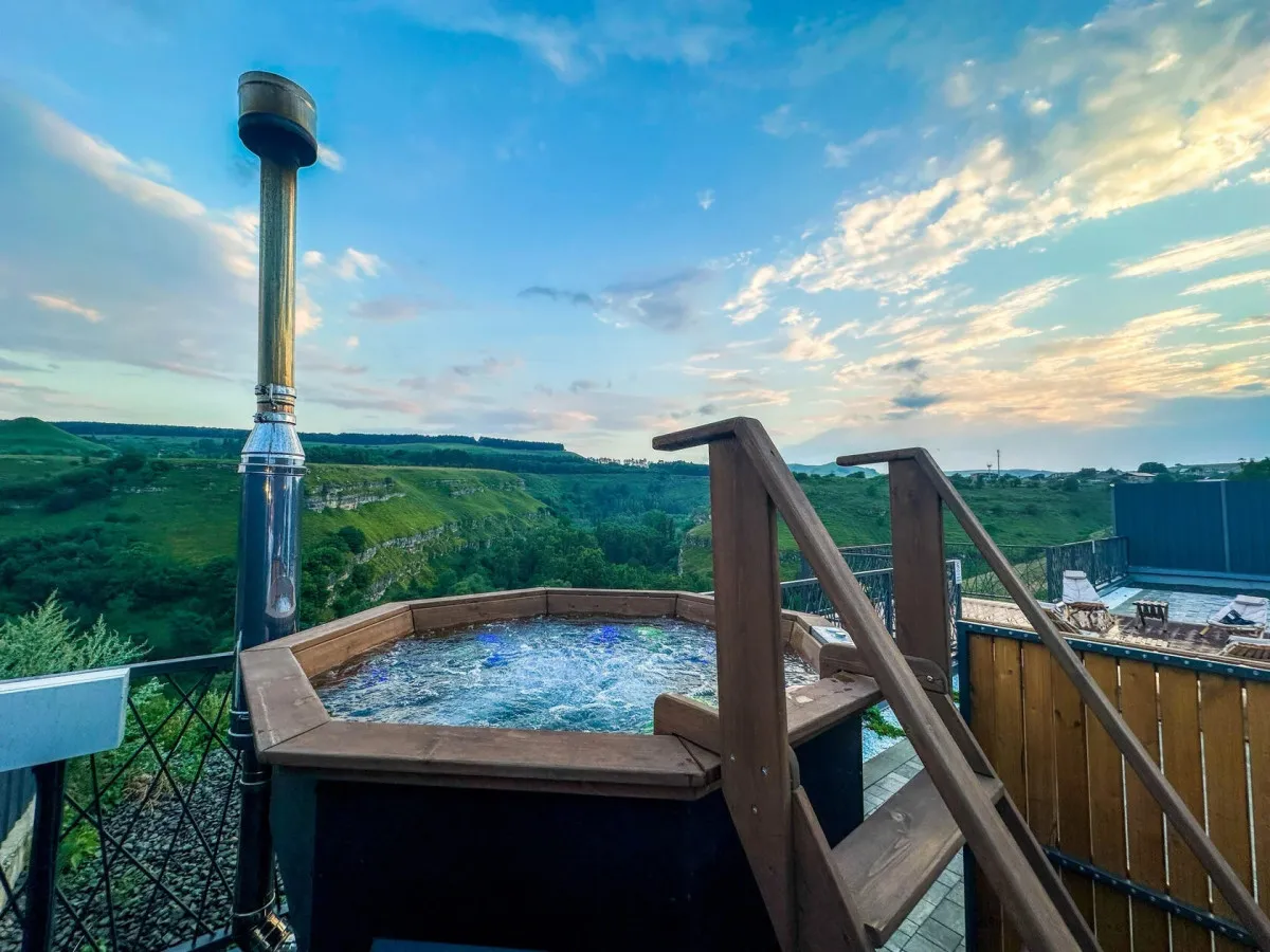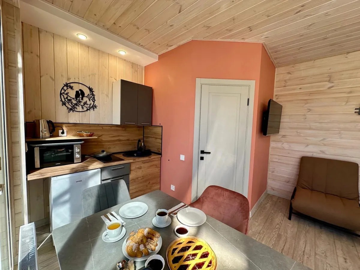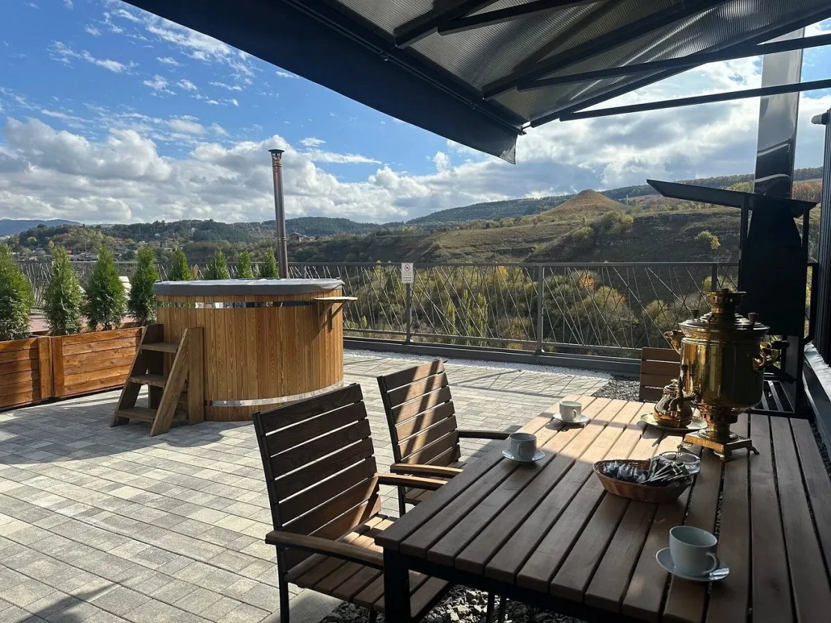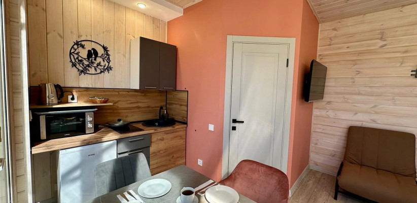 35 м2, вид на Аликоновское ущелье, отдельная зона барбекю, чан на дровах, двуспальная кровать, кресло-кровать, оборудованная кухонная зона. Количество гостей: 3