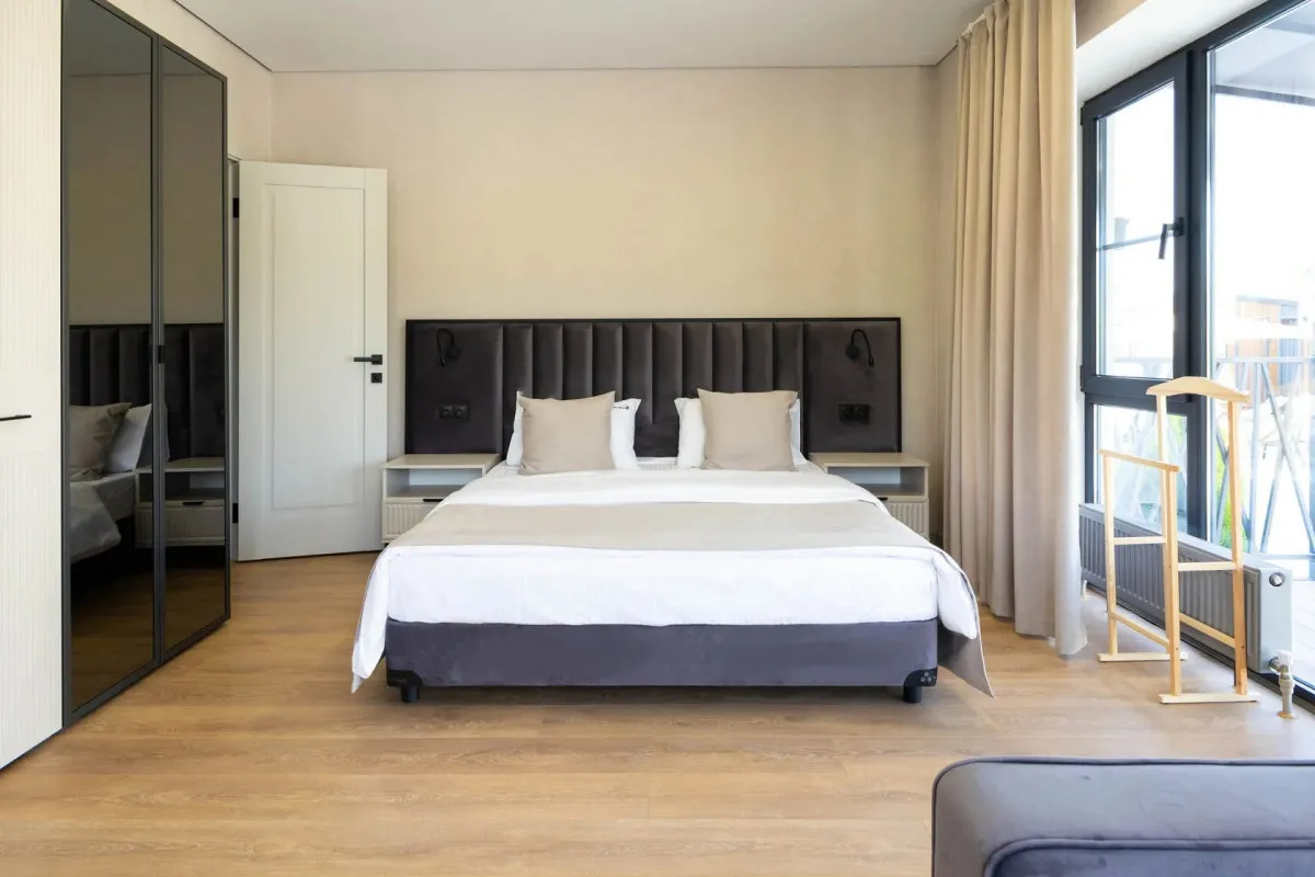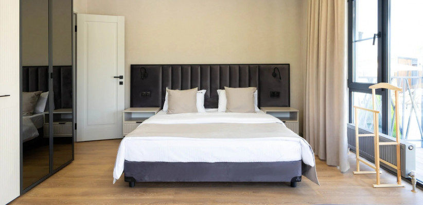 45 м2, с видом на бассейн, двуспальная кровать (с возможностью сделать раздельные спальные места), двухместный диван, оборудованная кухонная зона. Количество гостей: 5Апартаменты VIP