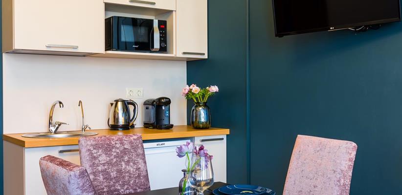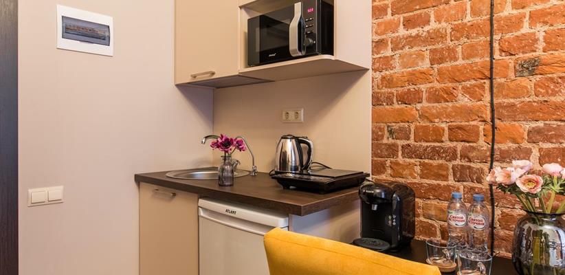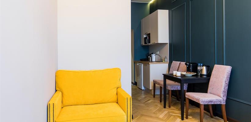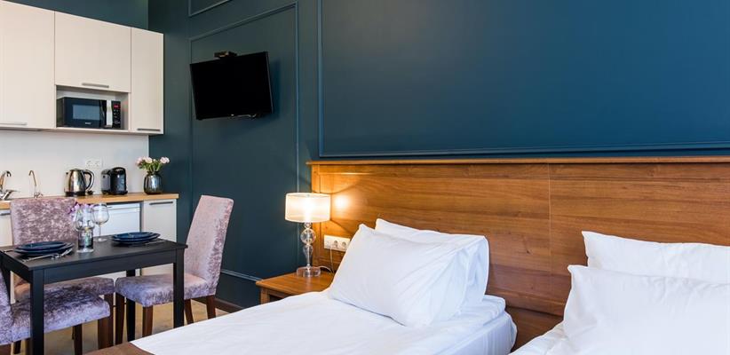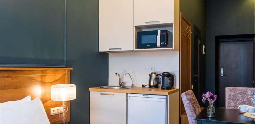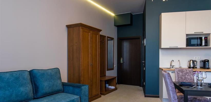 Всего 23 номера. Во всех номерах: бесплатный Wi-Fi, кухня с мини-холодильником и микроволновой печью, стол, стулья, телевизор, телефон, кофемашина, сплит-система, утюг, ванная комната с феном и туалетными принадлежностями, халаты, тапочки. Дополнительное место – кресло-раскладушка.