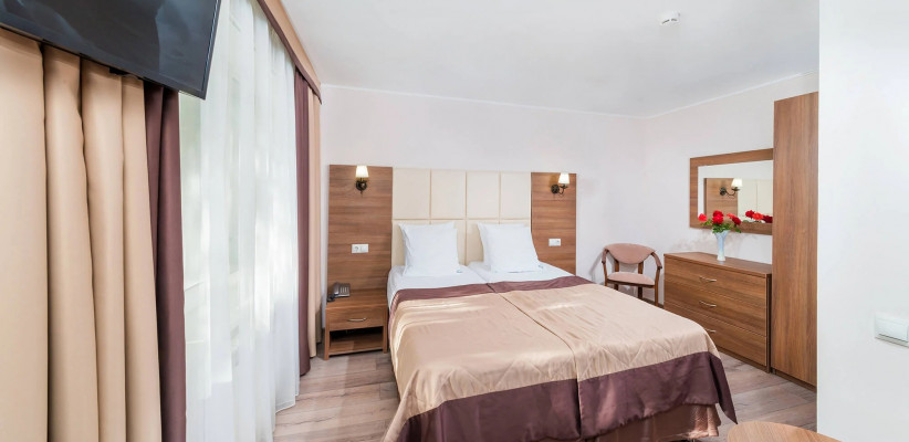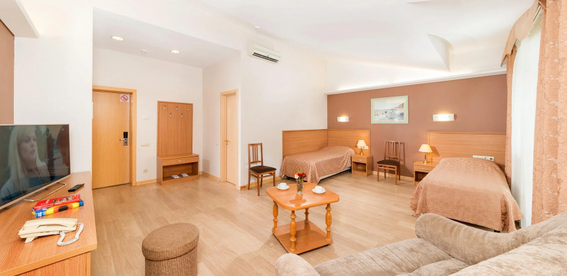 18 и 28 м2, две односпальные кровати, кресло-кровать. Количество гостей: 3«Стандарт» двухместный двухкомнатный (без балкона) (Корпус №7,11,12)