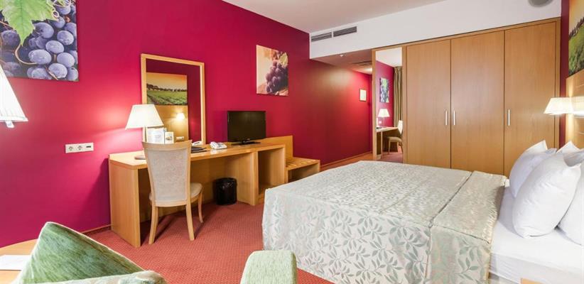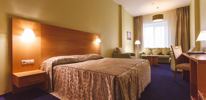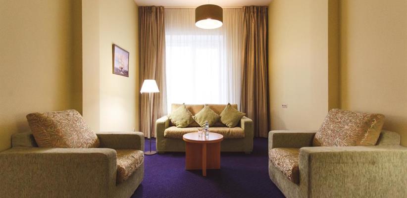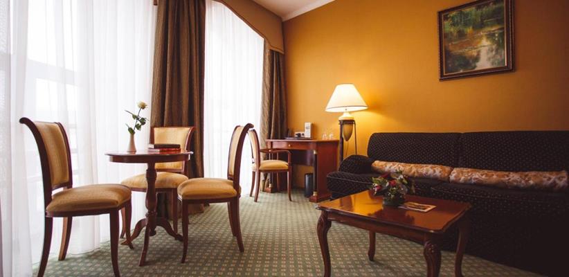 Люкс – двухкомнатный номер 49 кв. м., до 4 гостей, в номере двуспальная кровать, гостиная с диваном, креслами, журнальным столиком, обеденным столом и стульями, в стоимость проживания в номере данной категории входит 2 часа в СПА-центре отеля.
