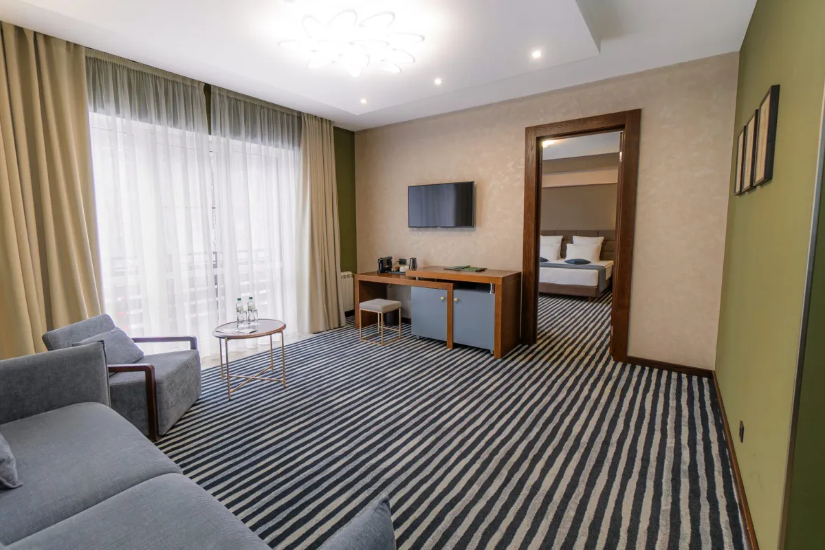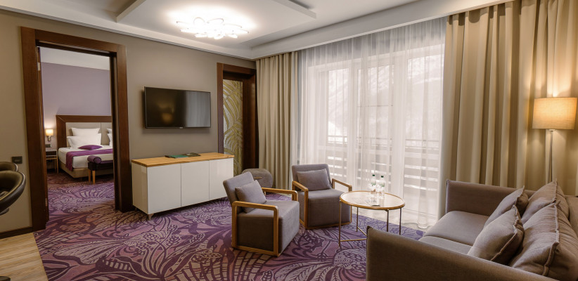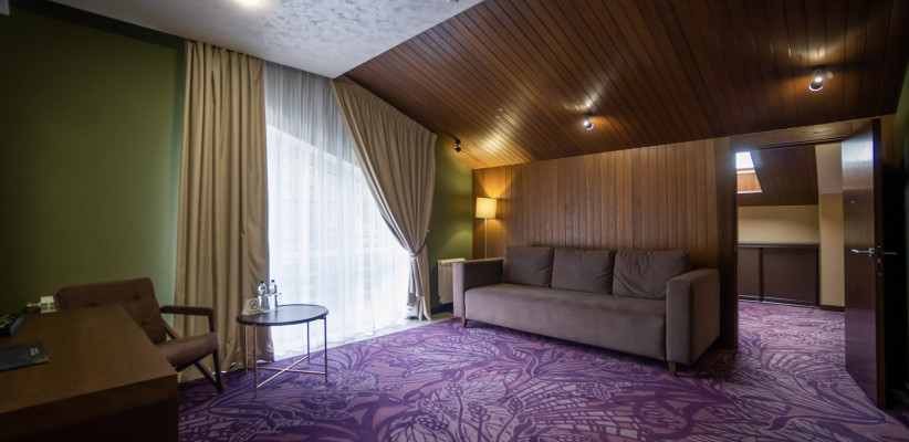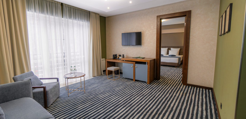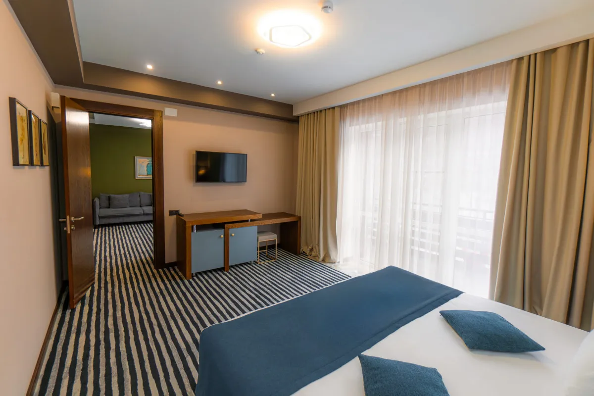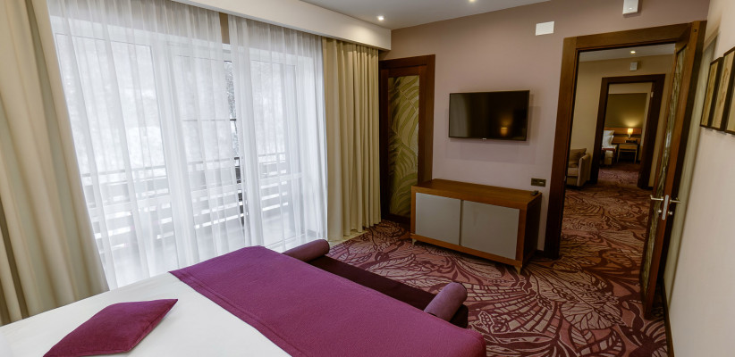 57 м2, номер состоит из двух комнат, двуспальная кроват и диван-кровать, балконСемейный Люкс