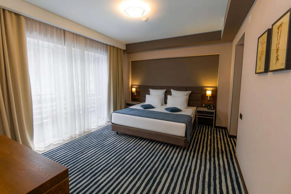 61 м2, номер состоит из спальни с большой двуспальной кроватью, спальни для детей оснащенной двумя полноразмерными односпальными кроватями, уютной гостиной с письменным столом, балконаАпартаменты