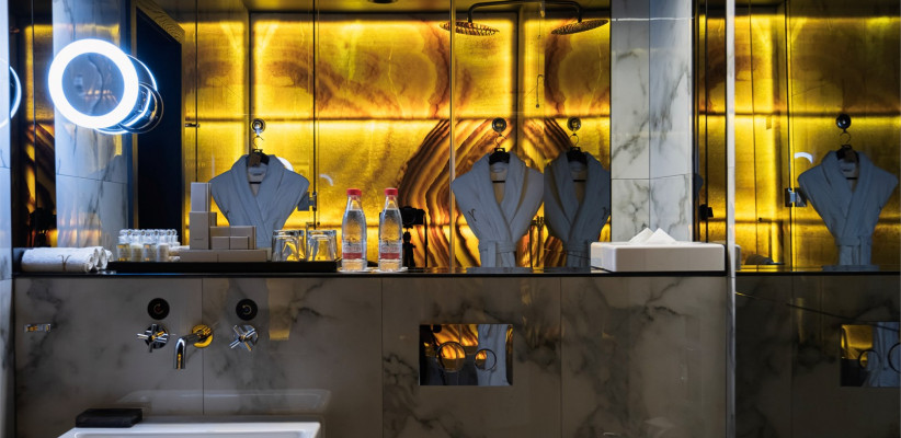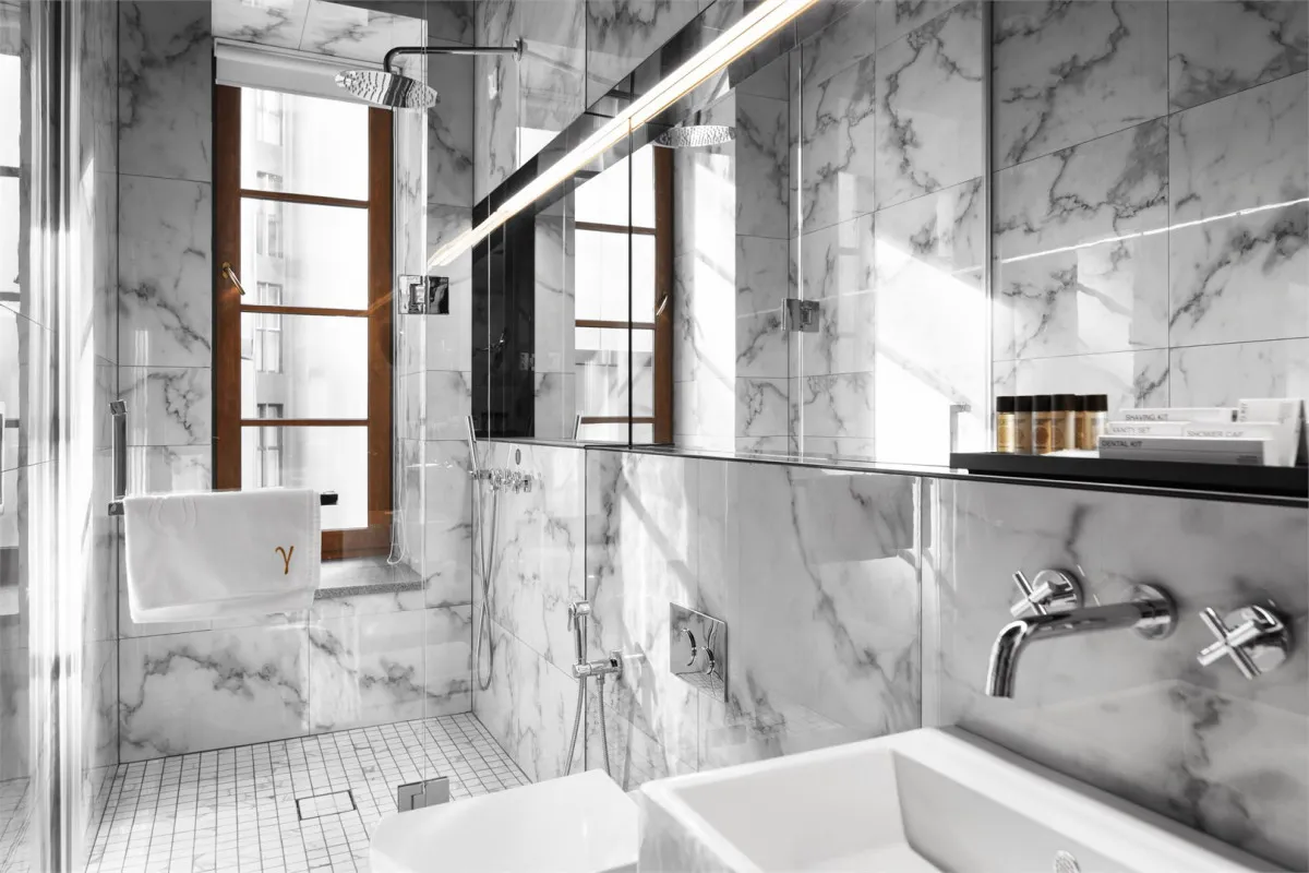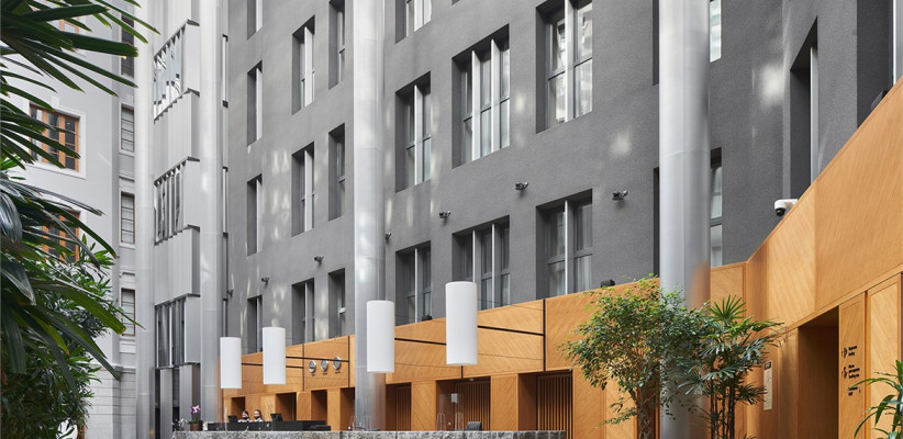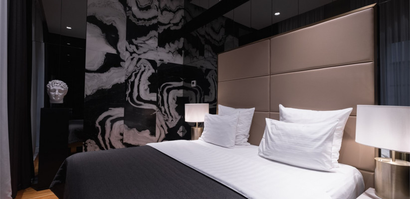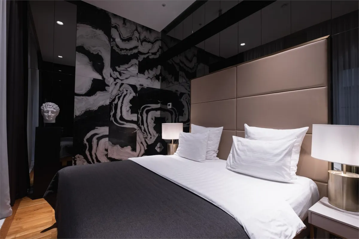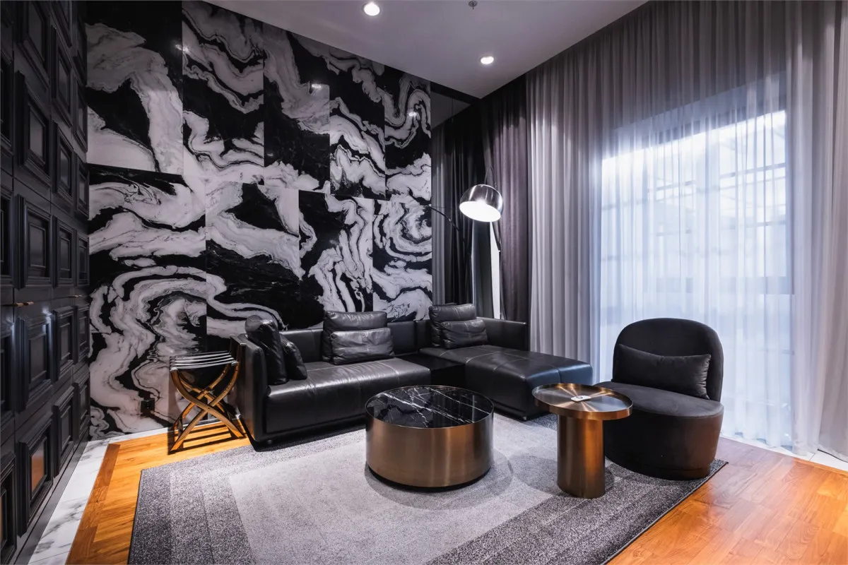 Интерьеры, созданные Михаилом Макаровым и Анастасией Смиренниковой, сочетают эстетику классического Петербурга и современные дизайнерские решения. Светлый атриум, ресторан NOK, бар Sculptors и СПА-салон Nero формируют атмосферу уюта и эстетического наслаждения. В оформлении использованы мрамор, натуральное дерево и авторские предметы декора.