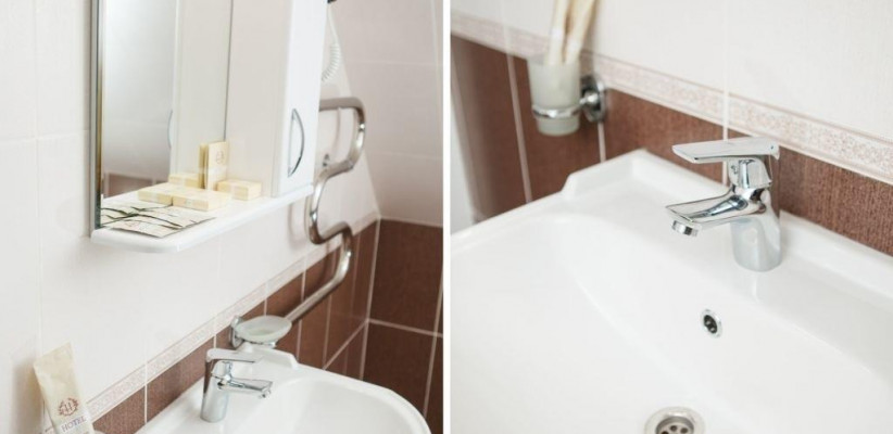 - Люкс Специализированный (28 кв. м) — люкс для людей с ограниченными возможностями. Номер расположен на первом этаже и имеет отдельный вход, оборудованный пандусом. Ширина входной двери не менее 0,90 см. Состоит из двух комнат: спальни 18 кв. м, гостиной 10 кв. м и просторной ванной комнаты 5 кв. м. Вместимость: до 4 гостей (2 на основных местах + 2 на дополнительном месте (раскладной диван). В номере: двуспальная кровать