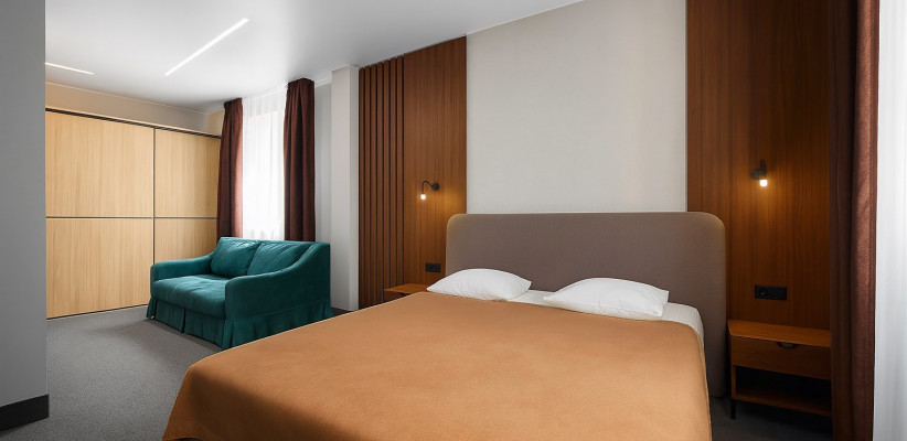 28 м2, двуспальная кровать, гостиная зона с диваном-кроватью. Количество гостей: 2 + 2 доп. места. Расположение 2, 3, 4, 5 этажиСтандарт без балкона Мансарда (2 корпус)