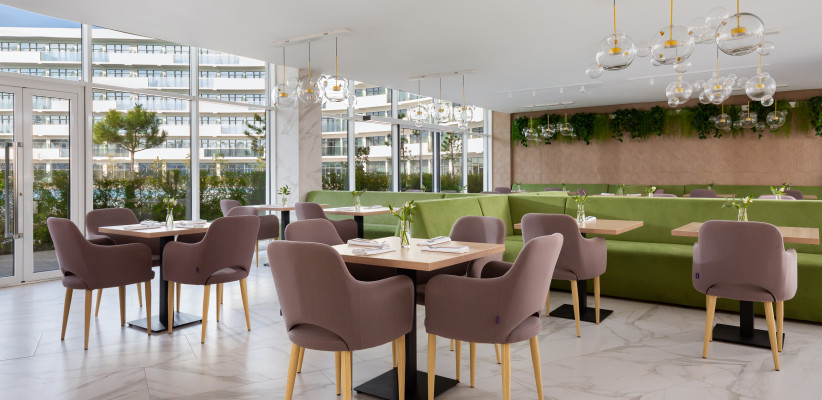 - Грин Ти – основной ресторан отеля на 1-м этаже с системой питания «Шведский стол». Представлено диетическое и постное меню, десерты и шоколадный фонтан. Для маленьких гостей предусмотрен отдельный зал с детским шведским столом для детей от 6 месяцев до 12 лет. Время работы: завтрак с 07:00 до 12:30 (с 11:00 до 12:30 работают только станции со снеками), обед с 13:00 до 17:30 (с 16:00 до 17:30 работают только станции со снеками), ужин с 18:00 до 23:00 (с 21:00 до 23:00 работают только станции со снеками)