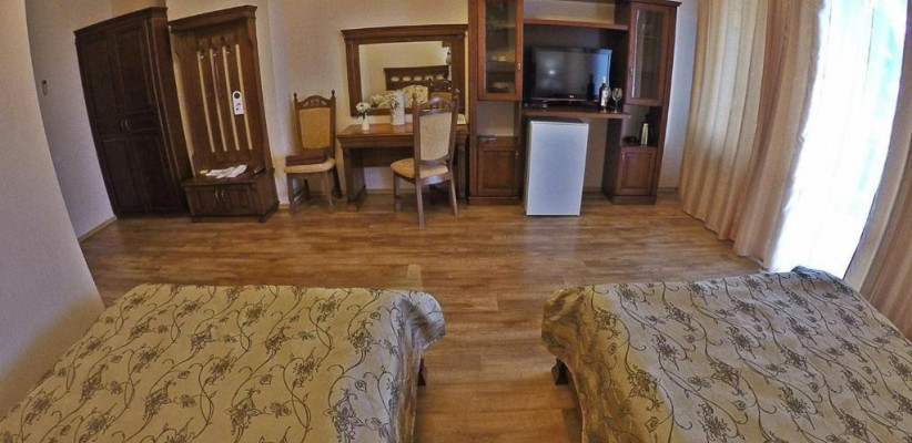 - 2-комнатный Премиум Люкс (55—66 кв. м) — 2-х комнатные, 2-х местные просторные номера с одной двуспальной кроватью и дополнительно диван-кроватью + 2 кресла или диван-кровать + 1 кресло, с ванной или душевой кабиной, оформленные в современном стиле. Комфортные и светлые номера с выходом на террасы, оснащенные дачной мебелью, где можно принимать солнечные ванны. Комфортабельный номер (5 этаж), выполненный в лиловом дизайне (для молодоженов), два номера на 2 и 5 этажах с мини-кухней. Номера семейного типа, с возможностью размещения на доп. месте. Всего 7 номеров. Номера оснащены: плоским телевизором, балконом с видом на море, феном, кондиционером, холодильником, Wi-Fi, кухней в одном номере, внутренним телефоном