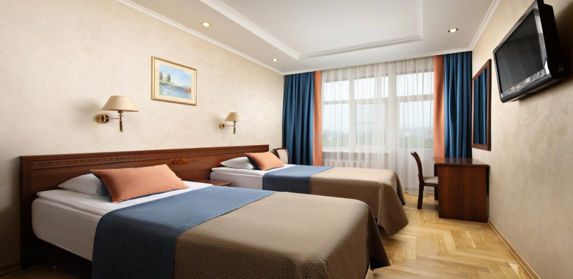 28 м2, с видом на внутреннюю территорию комплекса санатория; в номере две односпальные кровати, чайная станция, в ванной: фен, халат, тапочки, туалетный набор (шампунь, гель для душа, мыло, шапочка для душа, зубной набор), швейный набор; номера находятся на 2–5 этаже. Количество гостей: основное место – 2 чел., доп. место – 2 чел.«Люкс» 1-й этаж - номер на двоих (Люкс-корпус)