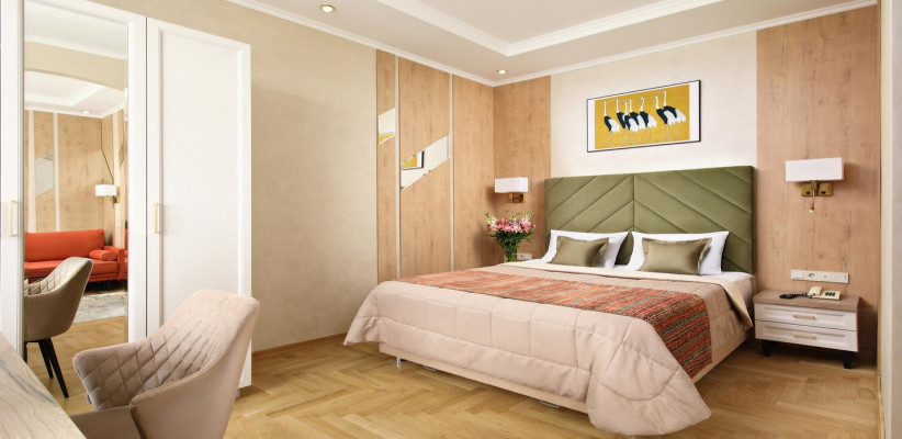 54 м2, с балконом с видом на внутреннюю территорию комплекса санатория и Эльбрус; в номере двуспальная кровать, ЖК-телевизор (в каждой комнате), чайная станция, в ванной: фен, халат, тапочки, туалетный набор (шампунь, гель для душа, мыло, шапочка для душа, зубной набор), швейный набор; номера находятся на 1–4 этаже. Количество гостей: основное место – 2 чел., доп. место – 2 чел.«Люкс» - номер на двоих (Люкс-корпус)