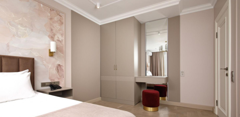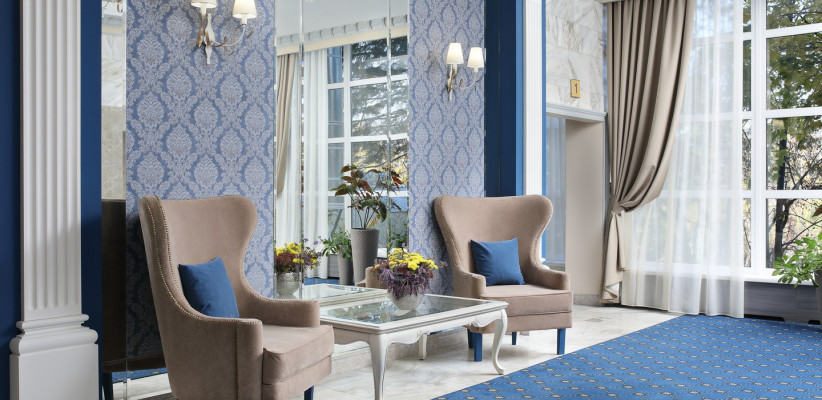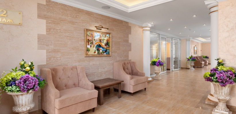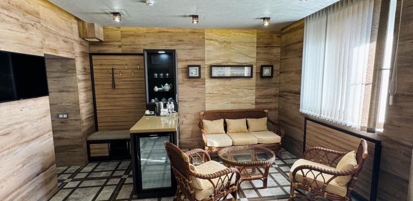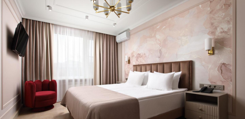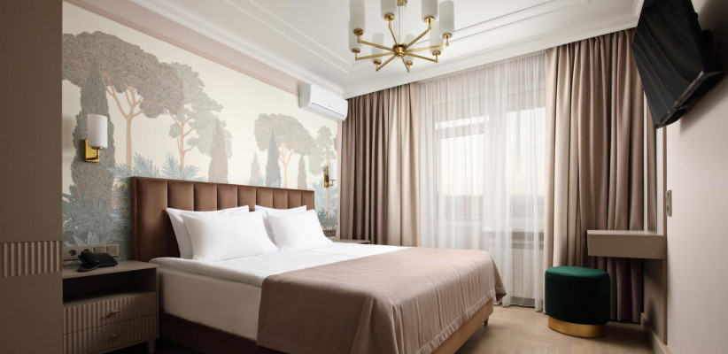 43,1 м2, с видом на внутреннюю территорию комплекса санатория; в номере двуспальная кровать, ЖК-телевизор (в каждой комнате), чайная станция, в ванной: фен, халат, тапочки, туалетный набор (шампунь, гель для душа, мыло, шапочка для душа, зубной набор), швейный набор; номера находятся на 2–5 этаже. Количество гостей: основное место – 2 чел., доп. место – 2 чел.«Люкс» студия - номер на двоих (Люкс-корпус)