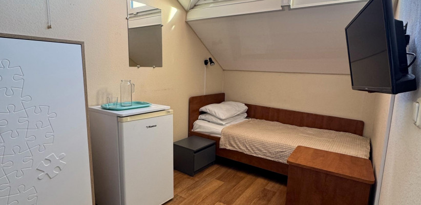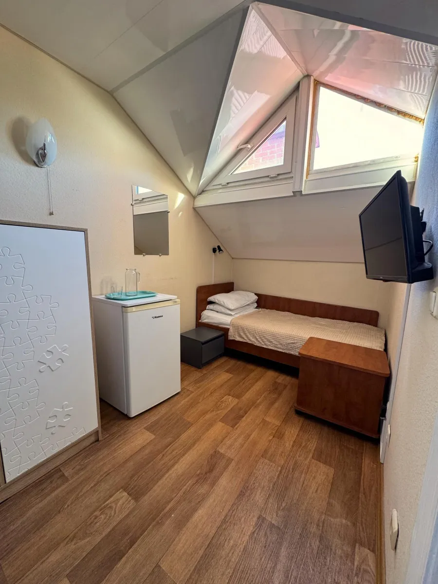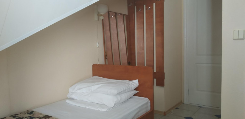 6-7 м2, кровать односпальная. Общий санузел на блок. Номера мансардные (скошенный потолок), в потолке маленькое треугольное окно. Количество гостей: 1Эконом 1-местный 1-комнатный