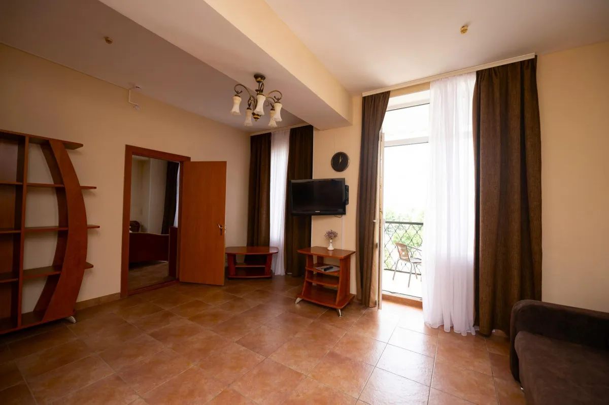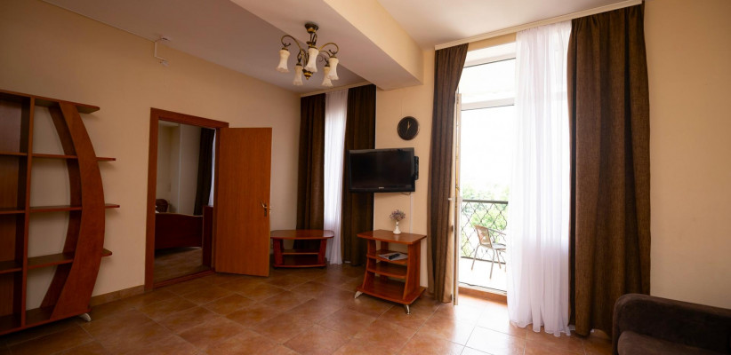 32 м2, в номере выделены зона спальни и гостиной. Межкомнатной двери между ними нет. Кровати односпальные, раскладной диван и кресло-кровать. В нескольких номерах доп.места – это раскладное кресло и еврораскладушка. Балкон. Количество гостей: 4Люкс 3-местный 2-комнатный