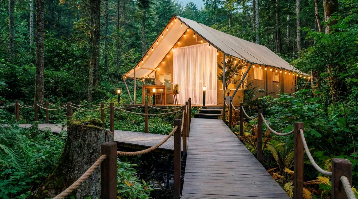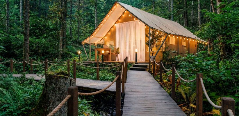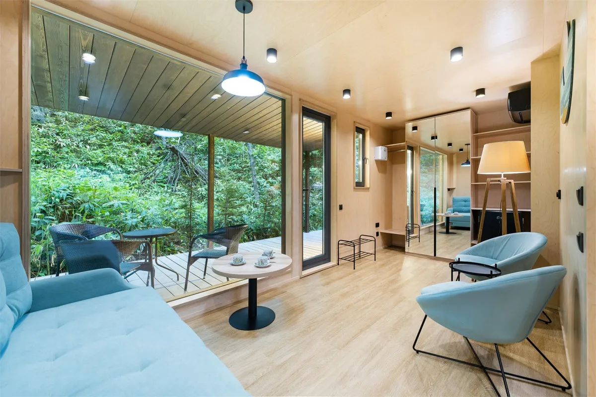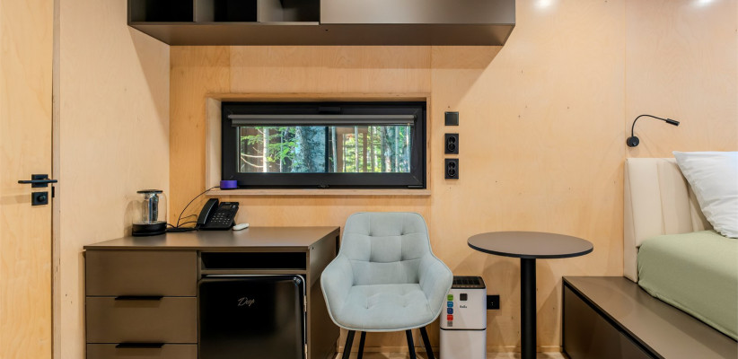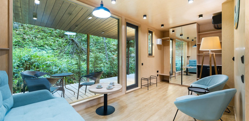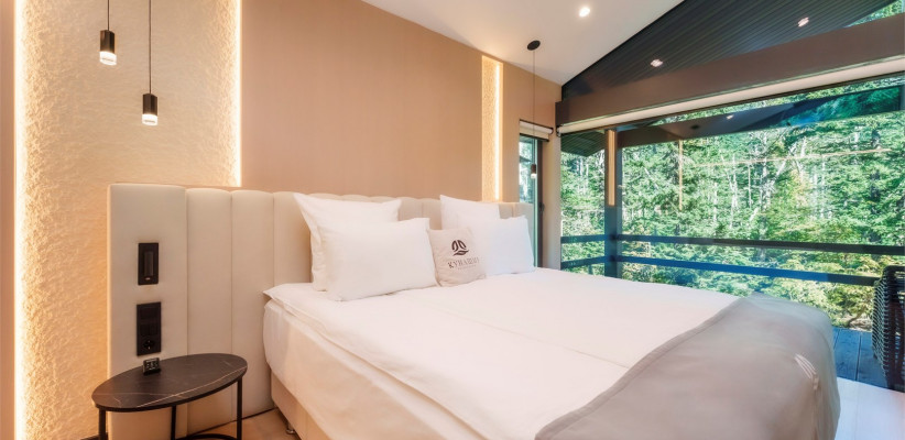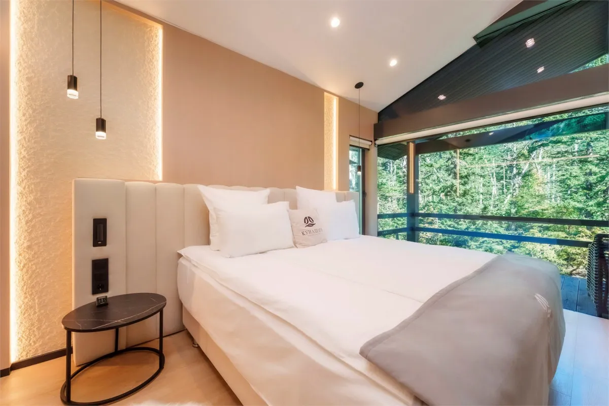 Номерной фонд отеля представлен отдельно стоящими домиками, шале и сафари-тентами с видом на краснокнижный лесДвухместный стандарт